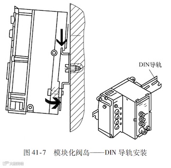 使用标准的导轨,导轨固定安装在控制柜、墙面或者机架上,选用合适的安装支架附件就可以把阀岛牢固地卡在DIN 导轨的槽架上,如图41-7所示。