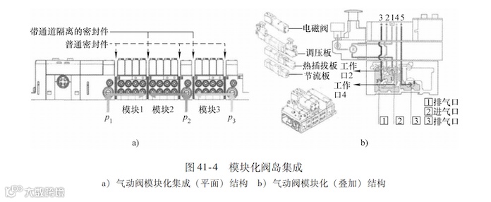 如图41-4b所示,模块化阀岛的气动部分还能以垂直叠加安装的方式,在阀片和气路板底座之间安装热插拔板、垂直供气板、调压板、节流板等模块,这些垂直叠加安装的功能模块可以根据要求有选择性的安装,其功能被分配在对应安装的阀片上,并且随时可以更改。虽然这种方式使阀岛的整体高度增加了,但是在一个位置上就能实现所有的气动功能,是一个非常集中和紧凑的设计。这种功能垂直叠加安装方式与传统的分别独立连接气源处理单元、减压阀、单向节流阀实现压力分区、减压、节流等功能的方式相比,不但大量减少了安装调试时间,而且极大降低了元器件的占用空间,有利于设备的小型化,从而节约设备的设计制造成本。用户在使用的时候,如果要调节多个阀片的输出工作压力或者气动执行机构的速度,只需在同一个阀岛上就能实现全部的功能调压。在设备维护改造时,不论是更换还是增加阀片以及相应的功能集成模块,都不需要拆开整个阀岛,这些都有效地缩短了设备的安装、调试和维护时间。