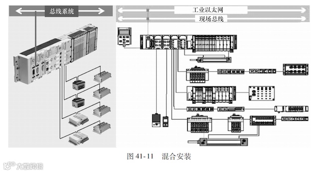使用多针接口型阀岛使设备的接口大为简化,但用户还必须根据设计要求自行将可编程控制器的输入/输出口与来自阀岛的电缆进行连接,而且该电缆随着控制回路的复杂化而加粗,随着阀岛与可编程控制器间的距离增大而加长。克服这一缺点,出现了新一代阀岛——现场总线型阀岛,如图41-3a所示。
