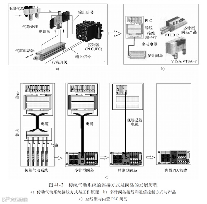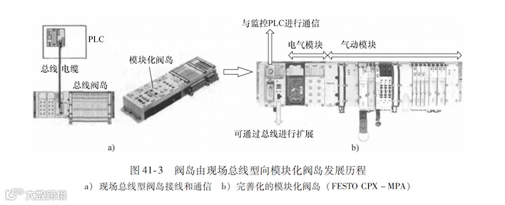 简化气动系统的安装并获得最佳的性能是气动自动化领域内厂商所面临的问题。解决这一问题的思路就是利用当时正在发展的电-气一体化控制技术,将这些阀组成模块单元,然后组装在一起形成一个集成阀块,并取名“阀岛”。随着工业互联网与总线的发展,这个气动集成所需要的信号通过总线的方式节省了大量的接线工作量,并减少了由接线产生的故障源,并且通过互联网可以与外界设备进行信息交流与沟通,图41-2b所示为当今“阀岛技术”的初衷。