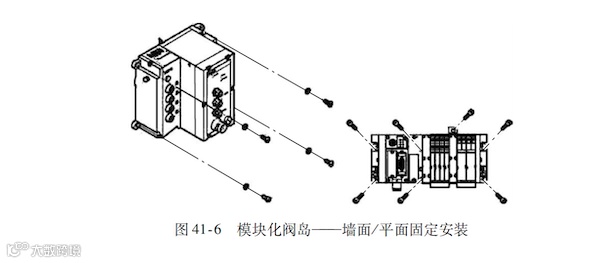 阀岛安装在坚固、平坦的墙面/平面上,为此需要在安装面上加工螺纹孔,便用垫片和安装螺钉进行固定,如图41-6 所示。