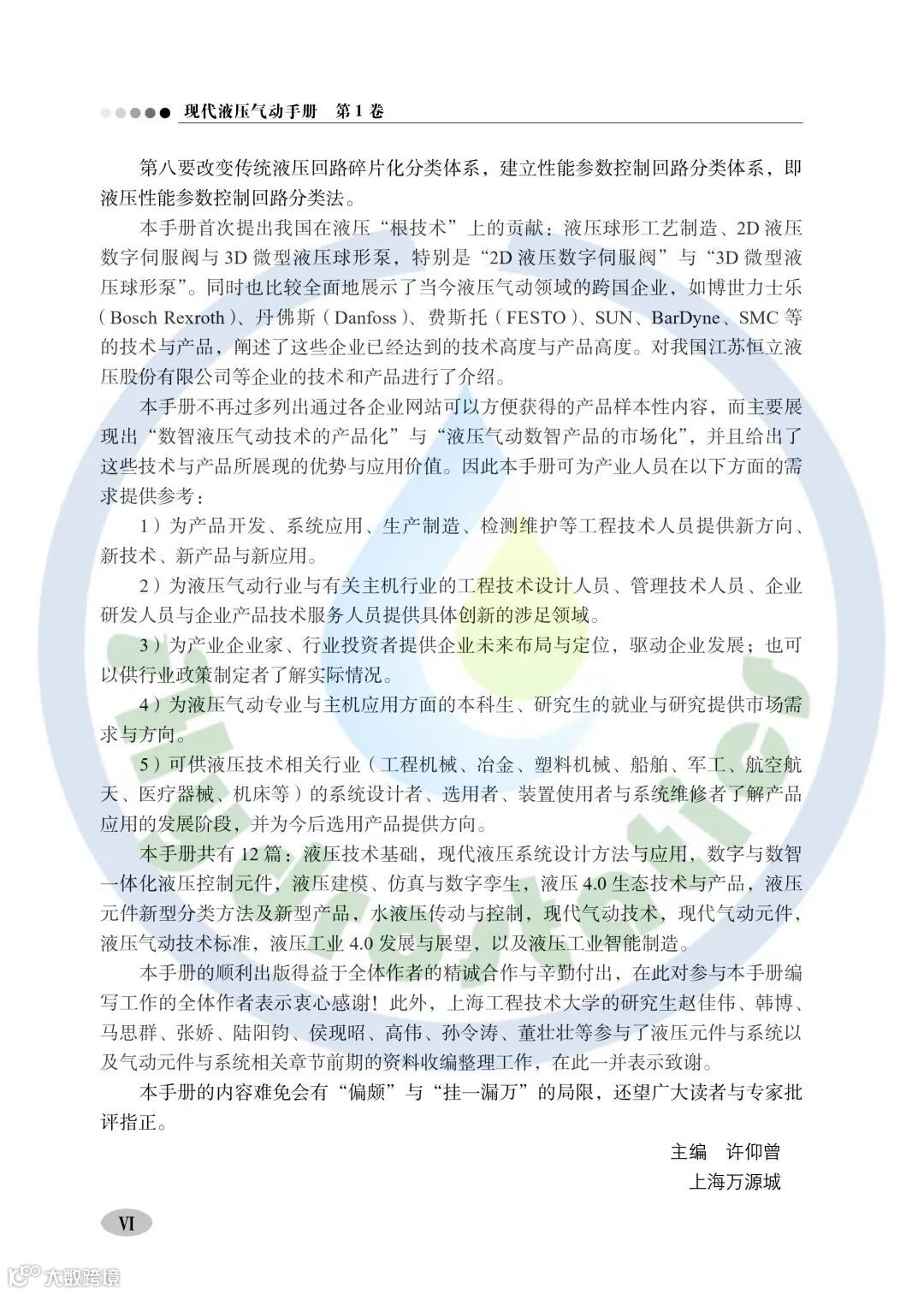 在工业4.0浪潮下,在《中国制造2025》指导下,我国制造业不断创新,正在由制造大国迈向制造强国,液压气动技术作为工业4.0的重要组成部分,对推动技术创新至关重要。为此,著名液压专家许仰曾教授特邀请工业4.0的发起单位之一,德国博世力士乐公司执行总裁斯蒂芬·哈克(Steffen Haack)教授博士、单建峰(Jianfeng Shan)博士,结合我国知名液压专家王兆强教授博士、许益民教授,组成了60多人的老中青行业专家与院校学者结合、国内外企业家与专家结合共同编纂《现代液压气动手册》,历经五载编撰而成,借助机械工业出版社的强大出版平台,即将出版发行。