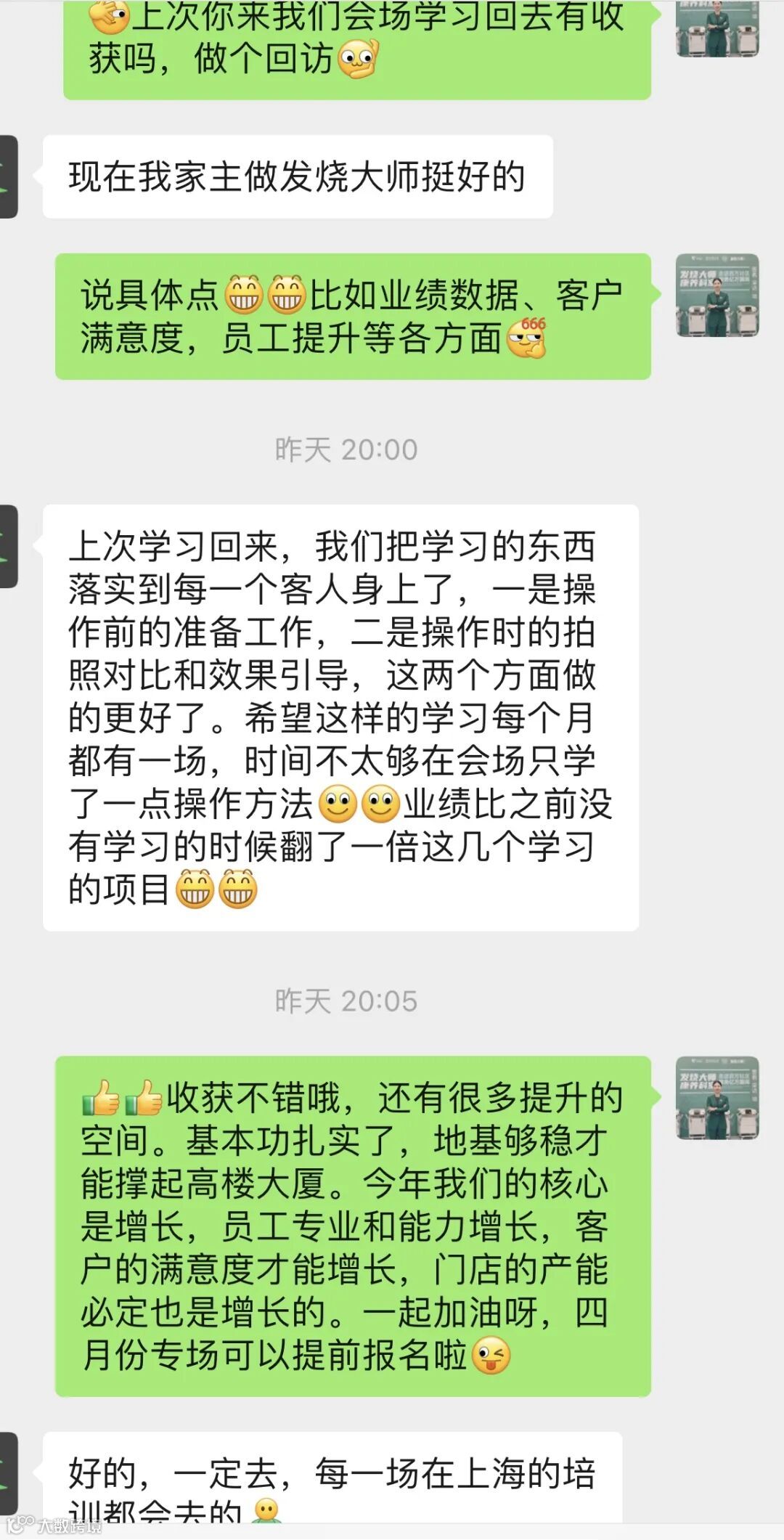 学员反馈:培训中掌握的内容都很好的落实在实践、给顾客的服务中,操作更标准专业了,也更懂得如何做好客户管理,业绩也得到显著提升。