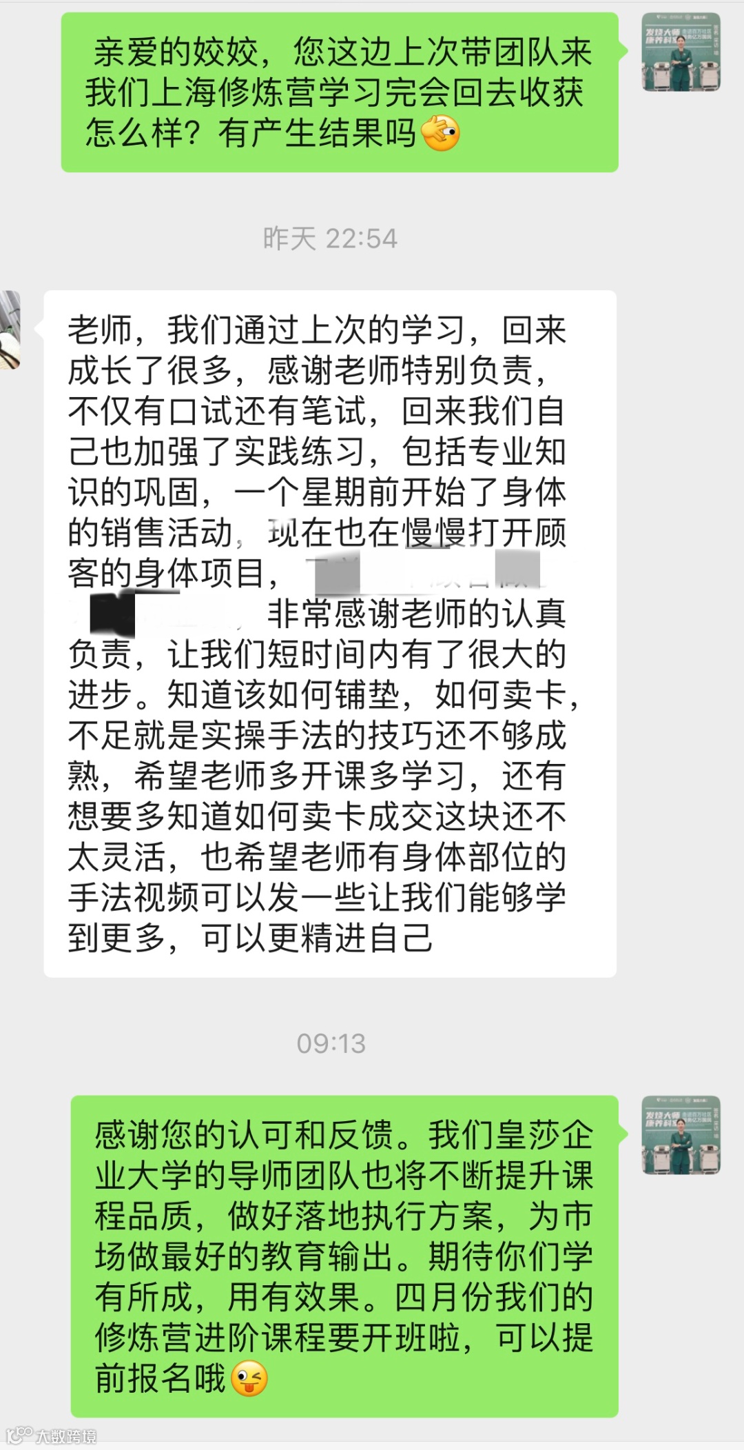 学员反馈:“学习之后门店实现项目升级,开始嫁接身体品项,不仅是在专业操作收获颇丰,还掌握了铺垫、销售等系统性的成交技巧”