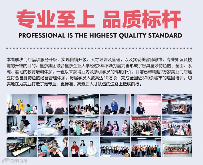 不为别的,只因“专业”二字,皇莎集团联合皇莎企业大学经过8年不断打磨完善形成了极具皇莎特色的:全面、系统、落地的教育培训体系,一直以来获得业内及参训学员的高度评价,目前已帮助超2万家美业门店建立符合自身特色的经营管理体系,历届学员人数高达10万余,完成全国近300余城市的巡回培训,切实地在为美业打造了更专业、更标准、高素质人才队伍的道路上砥砺前行。