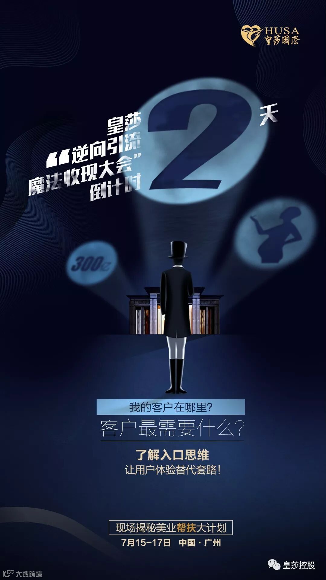 皇莎国际始终如一的站在时代背景下审时度势,抓住机遇,颠覆传统思维,以其独有的营销模式,帮扶千万美业经营者实现逆向盈利,资源与渠道双创新,吸引隐形消费客户群体。为了更好的帮扶美业业主们攻克营销难题,实现资源共享,皇莎国际将于7月15日至17日在广州富力空港假日酒店举行逆向引流 魔法收现大会,倾力打造金牌帮扶导师团,线下面对面分享盈利超级入口的独家秘钥。