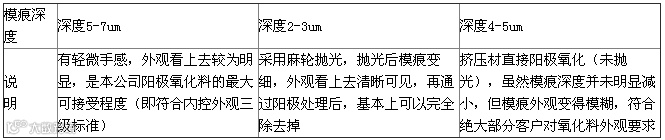 当模痕深度在8um以上时,用手触摸有明显手感,普通阳极处理就无法消除模痕对产品外观的影响。由此可见,阳极处理对模痕的消除程度是有限的,只有当模痕深度在7um以下时,普通阳极处理可以基本消除表面模痕对产品外观的影响。如果工序中设计有机械抛光工序,则挤压材的模痕深度可以允许放宽至10um左右。