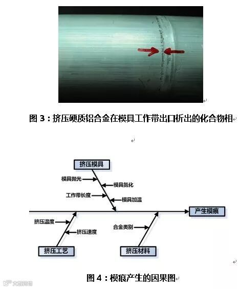 在挤压工艺方面,挤压温度越高,铝合金的粘度增加,会使挤出产品表面产生模痕的几率增加,同时,挤压速度过快也会导致模痕产生。在挤压5×××合金与7×××合金管材的时候,因材料的合金含量高,在挤压模具工作带的出口部位极易析出少量颗粒状的硬质化合物相(图3),使产品表面产生模痕,这种模痕多数情况下是不规则的,非连续的。模痕产生的因果图见图4。