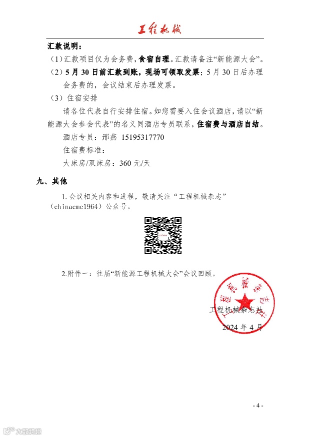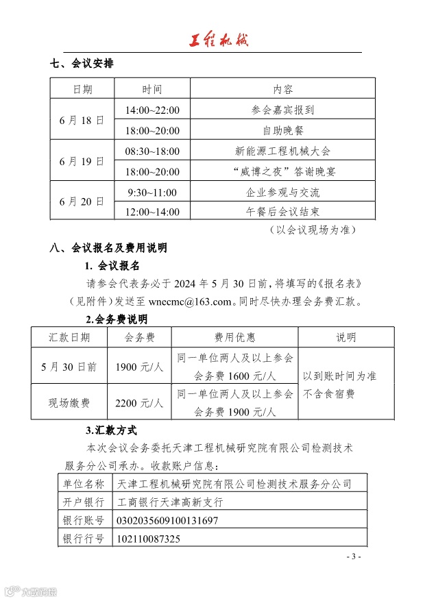 本次会议会务委托天津工程机械研究院有限公司检测技术服务分公司承办。收款账户信息: