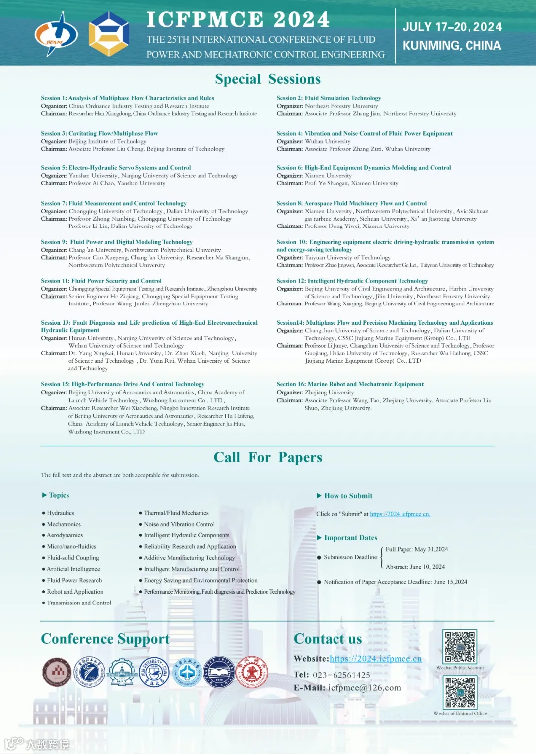第25届流体动力与机电控制工程国际学术会议将于2024年7月17-20日在昆明召开,以“创新驱动、数智未来”为主题,拟邀请国内外院士、国家杰青、长江学者等海内外知名专家学者作精彩的大会主题报告,同期举办青年科学家讲堂、企业家论坛、产学研对接会、期刊与学者面对面沙龙、International Journal of Hydromechatronics全球编委/青年编委会等活动,紧密围绕流体动力与机电控制工程的热点话题、技术创新、成果转化等内容进行多维度、多角度、深层次的交流和探讨,全力打造中国流体动力与机电控制领域学、研、政、产紧密结合的高端前沿合作与交流平台。