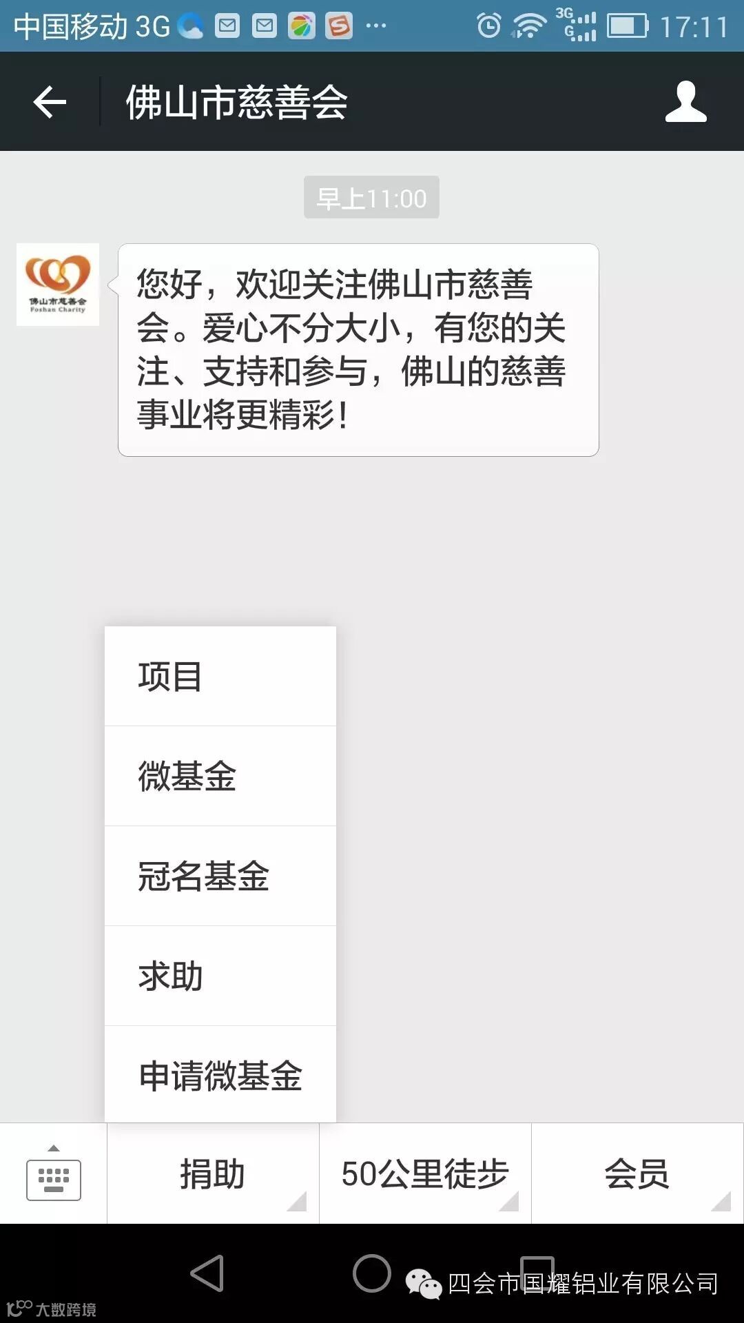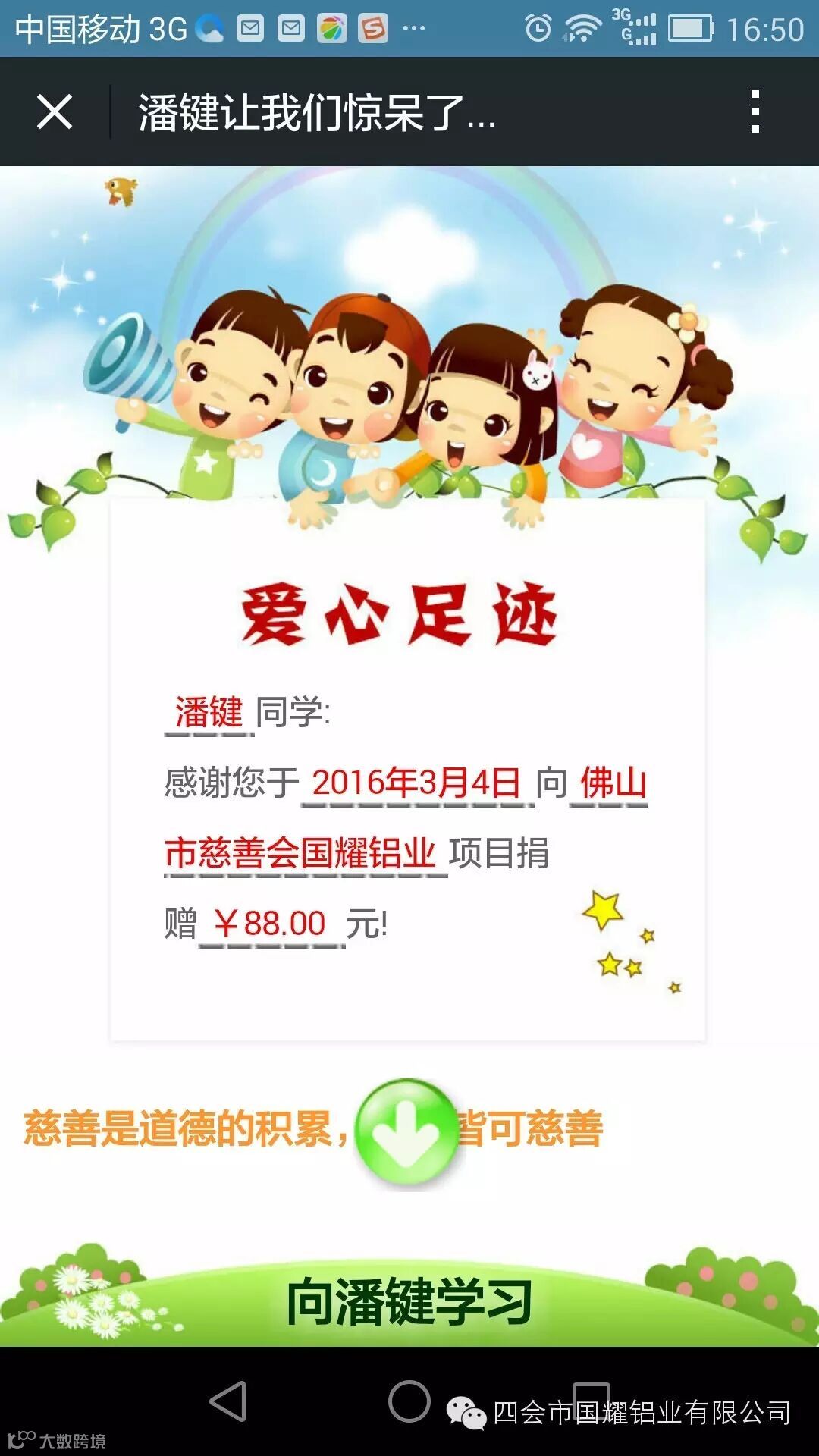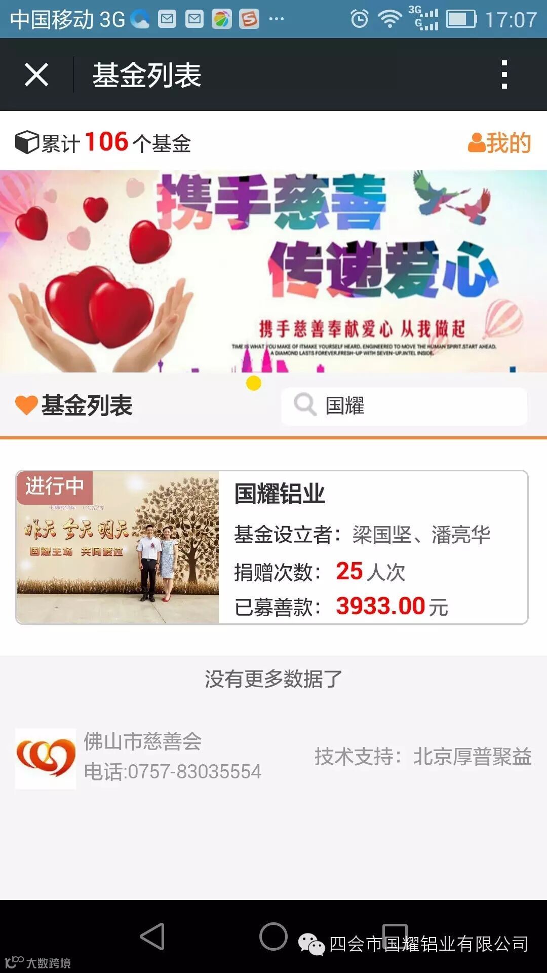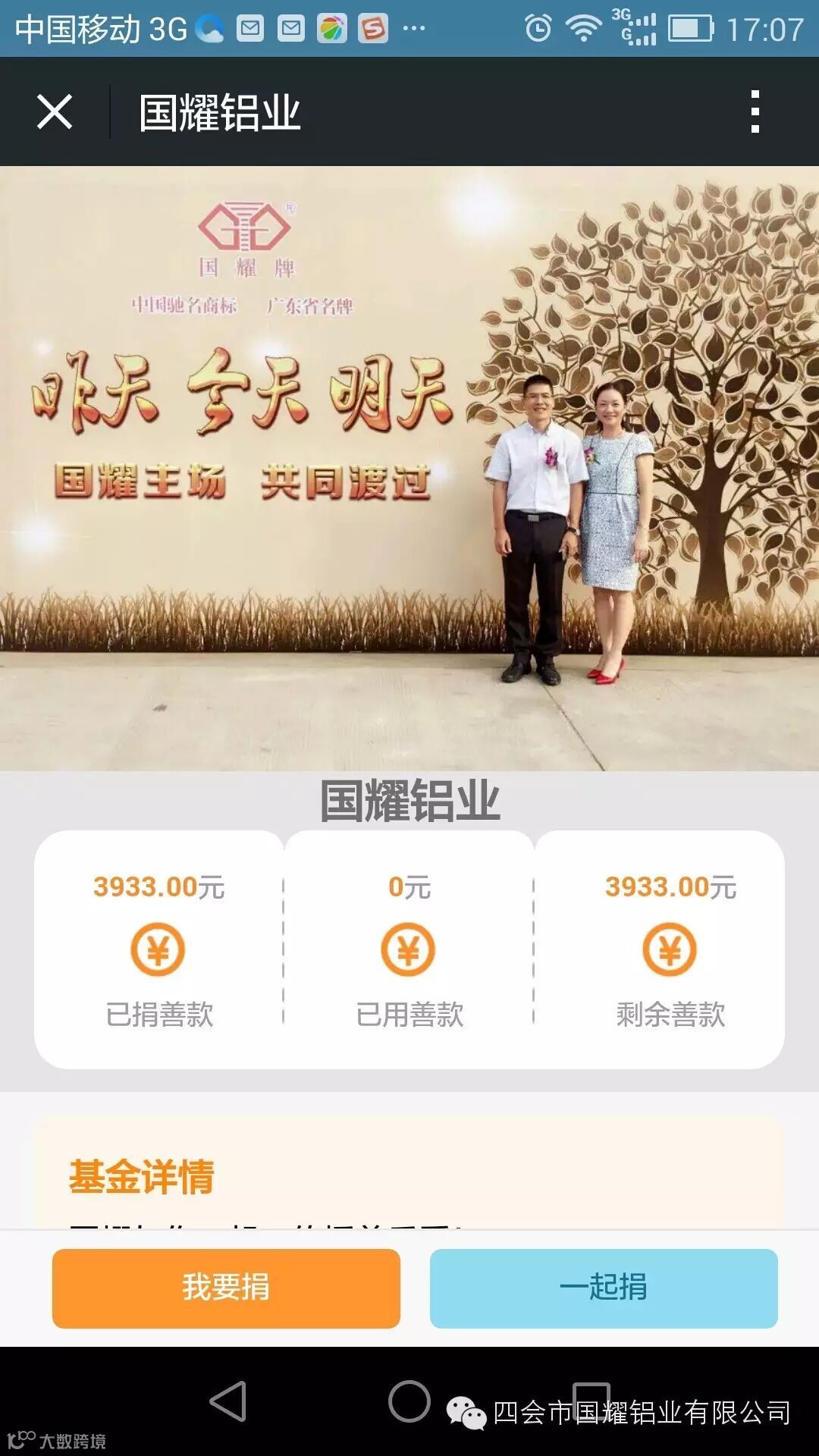 朋友您可以通过佛山市慈善会公众号菜单进入“捐助”—“微基金”,在列表中录入“国耀铝业”,搜索即可查看!进入后,点击“我要捐”微信支付,金额随喜!