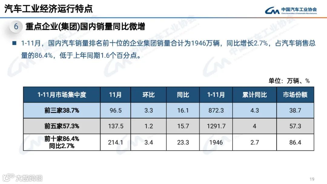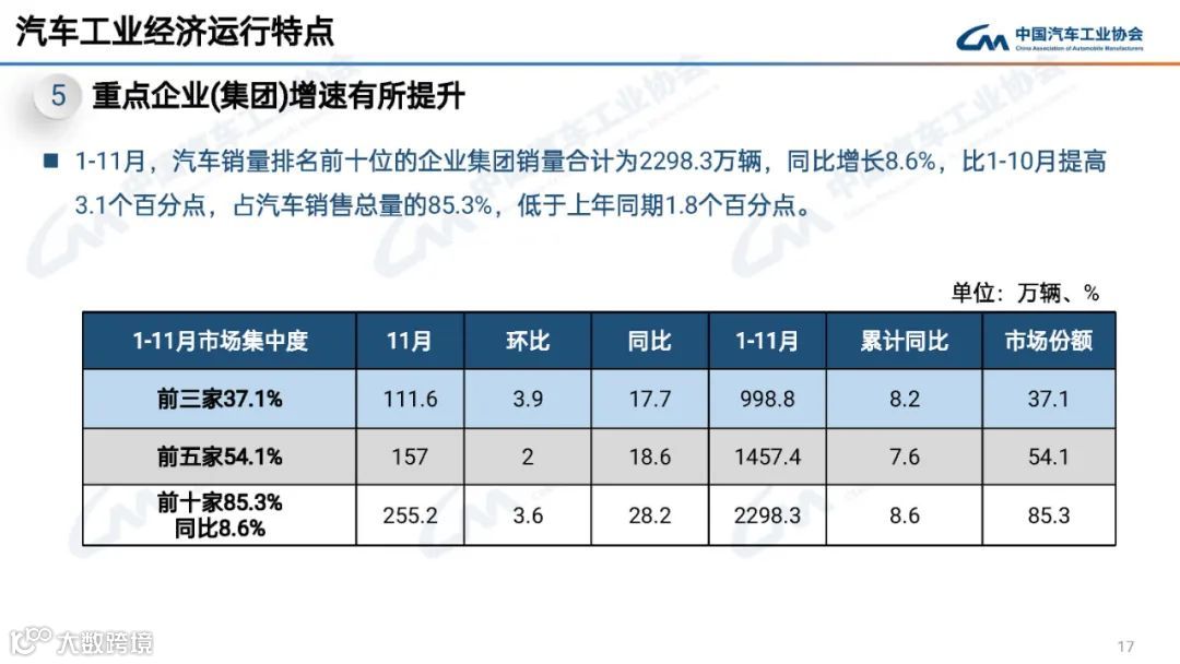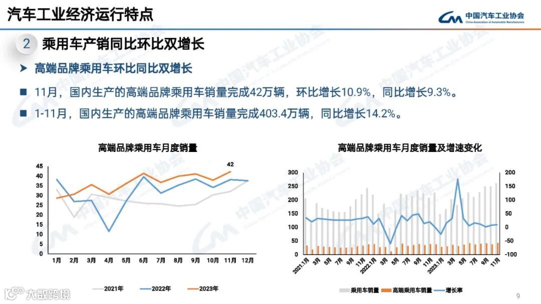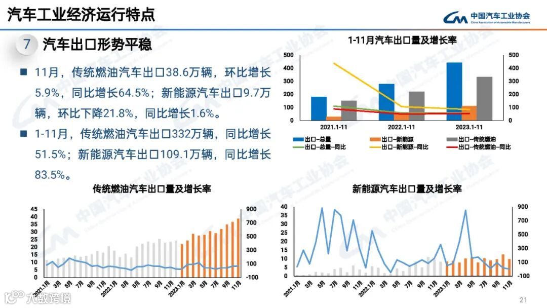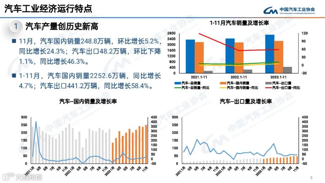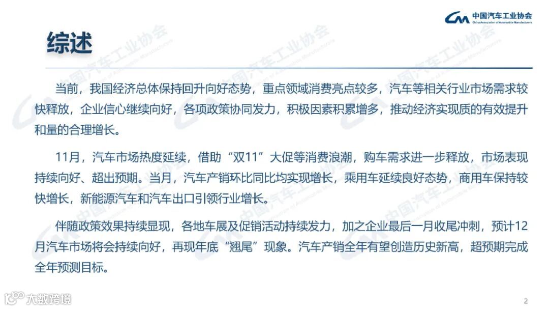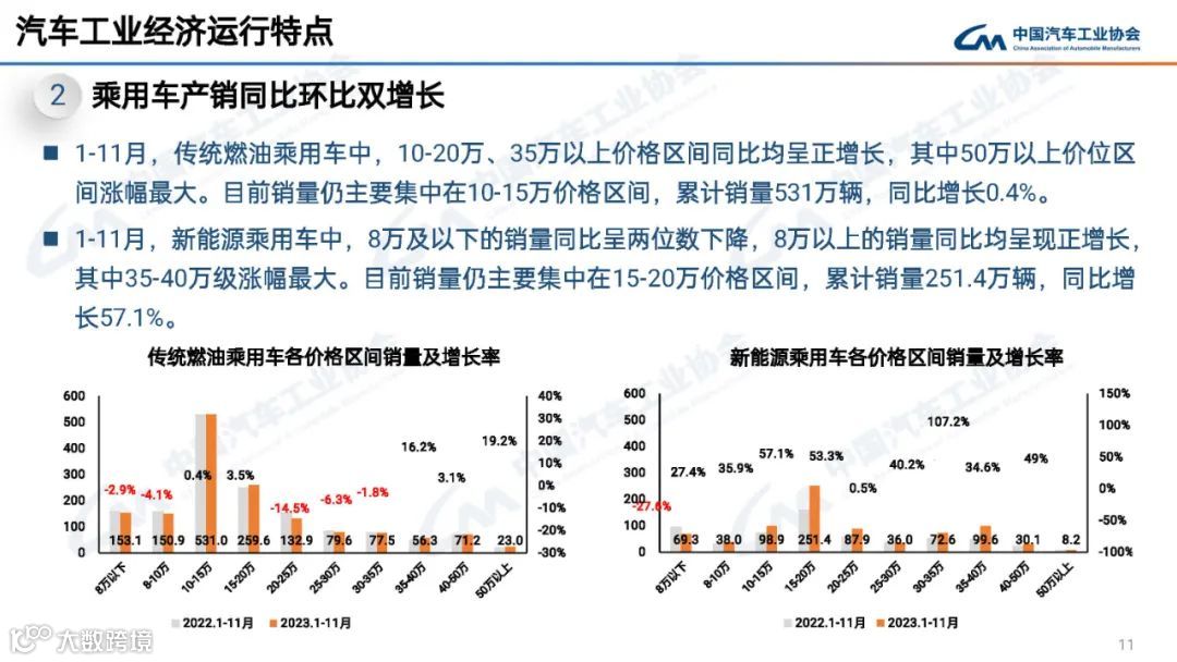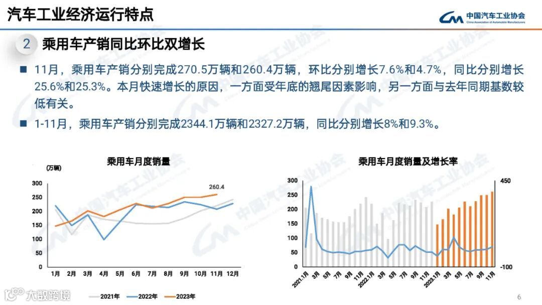 ➁ 乘用车:11月销量260.4万辆,增长25.3%;1-11月累计销量2327.2万辆,增长9.3%