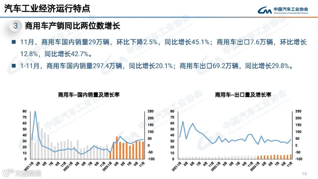 ➂ 商用车:11月销量36.6万辆,增长44.6%;1-11月累计销量366.6万辆,增长21.8%