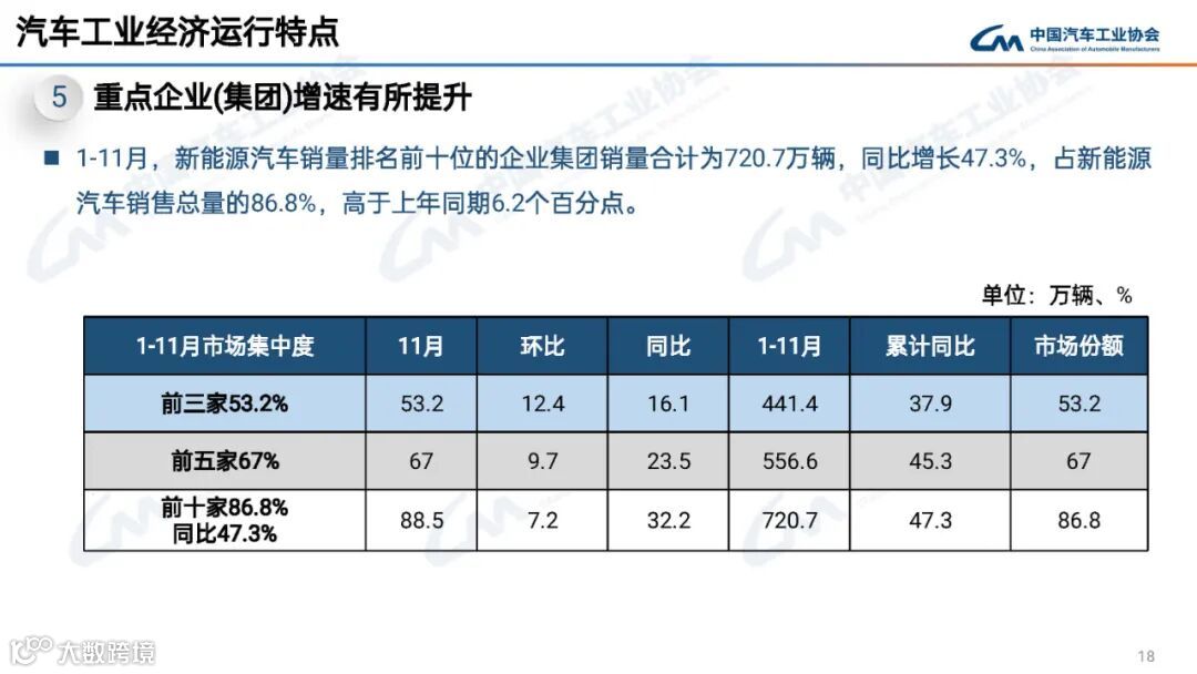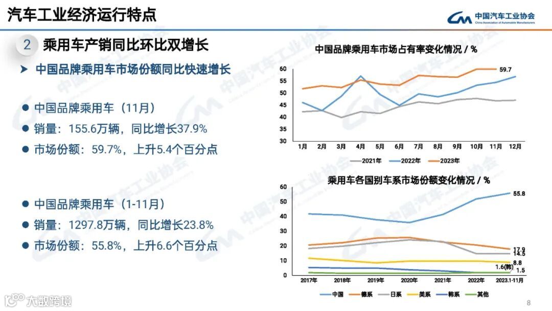 ➄ 中国品牌乘用车:11月销量155.6万辆,增长37.9%;1-11月累计销量1297.8万辆,增长23.8%