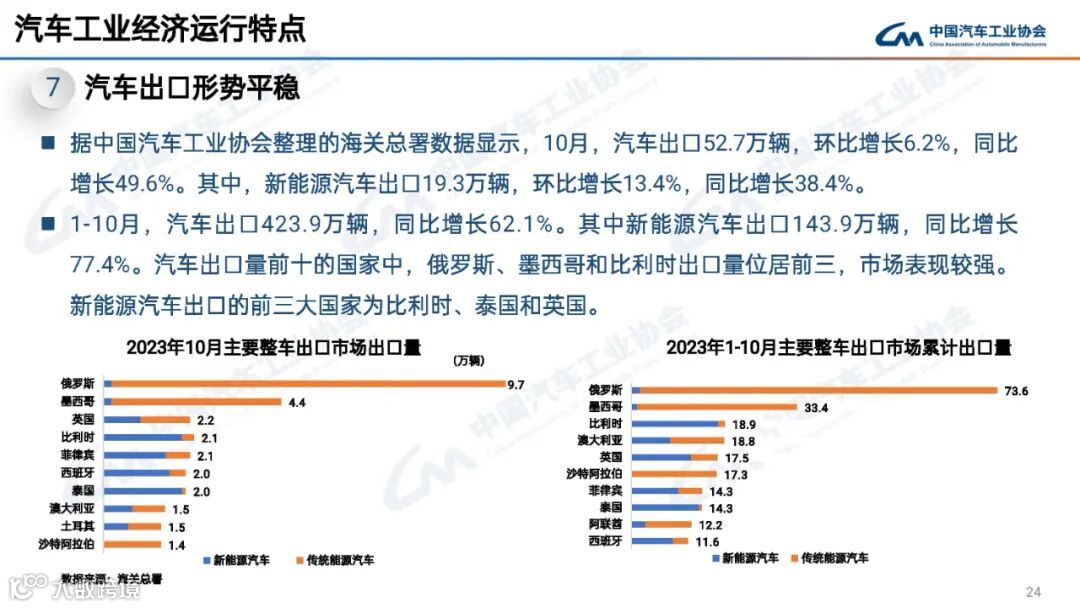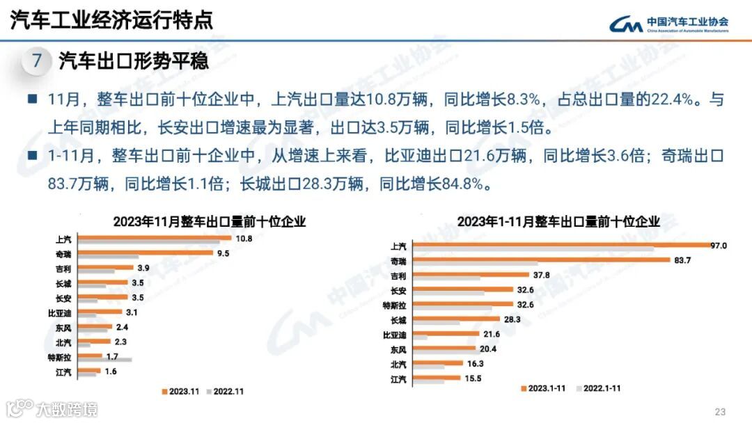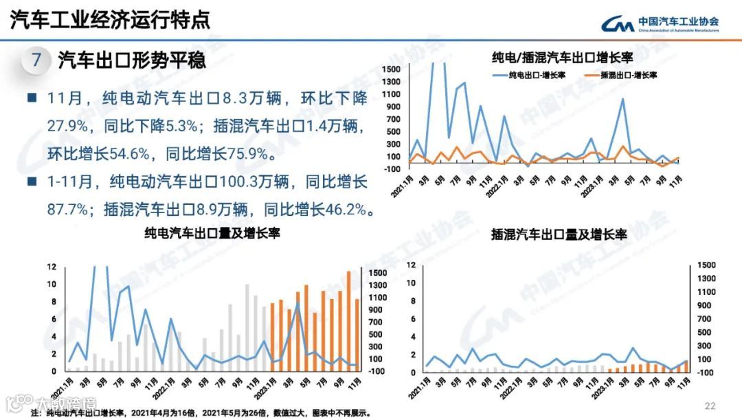 ➅ 汽车出口:11月出口量48.2万辆,增长46.3%;1-11月累计出口量441.2万辆,增长58.4%