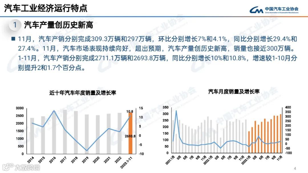 2023年11月,汽车产销分别完成309.3万辆和297万辆,环比分别增长7%和4.1%,同比分别增长29.4%和27.4%。11月,汽车市场表现持续向好,超出预期,汽车产量创历史新高,销量也接近300万辆。