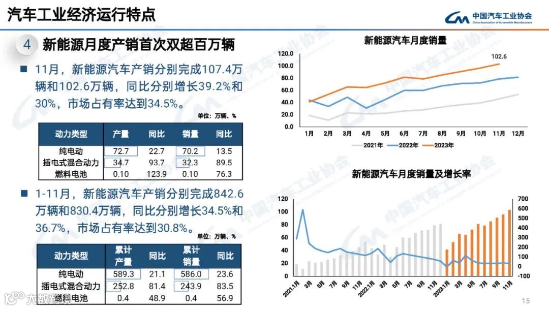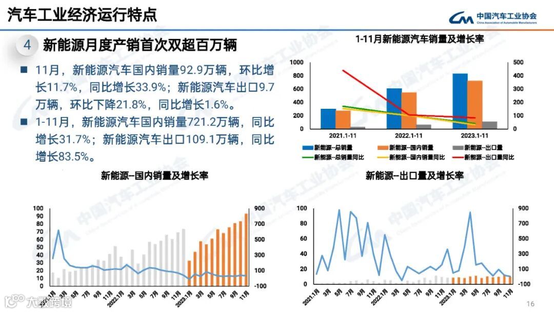 ➃ 新能源汽车:11月销量102.6万辆,增长30.0%;1-11月累计销量830.4万辆,增长36.7%