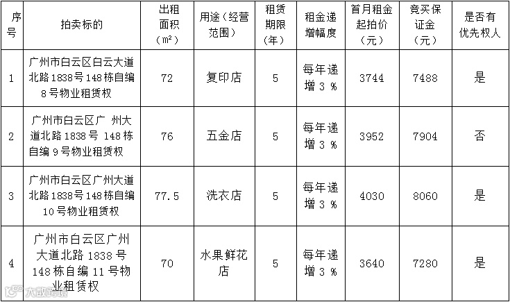2、序号1、2、4标的的竞买人须为具有独立承担民事责任能力的在中华人民共和国境内注册的法人、个体工商户;且竞买人须持有与招租用途相符的经营范围的营业执照。