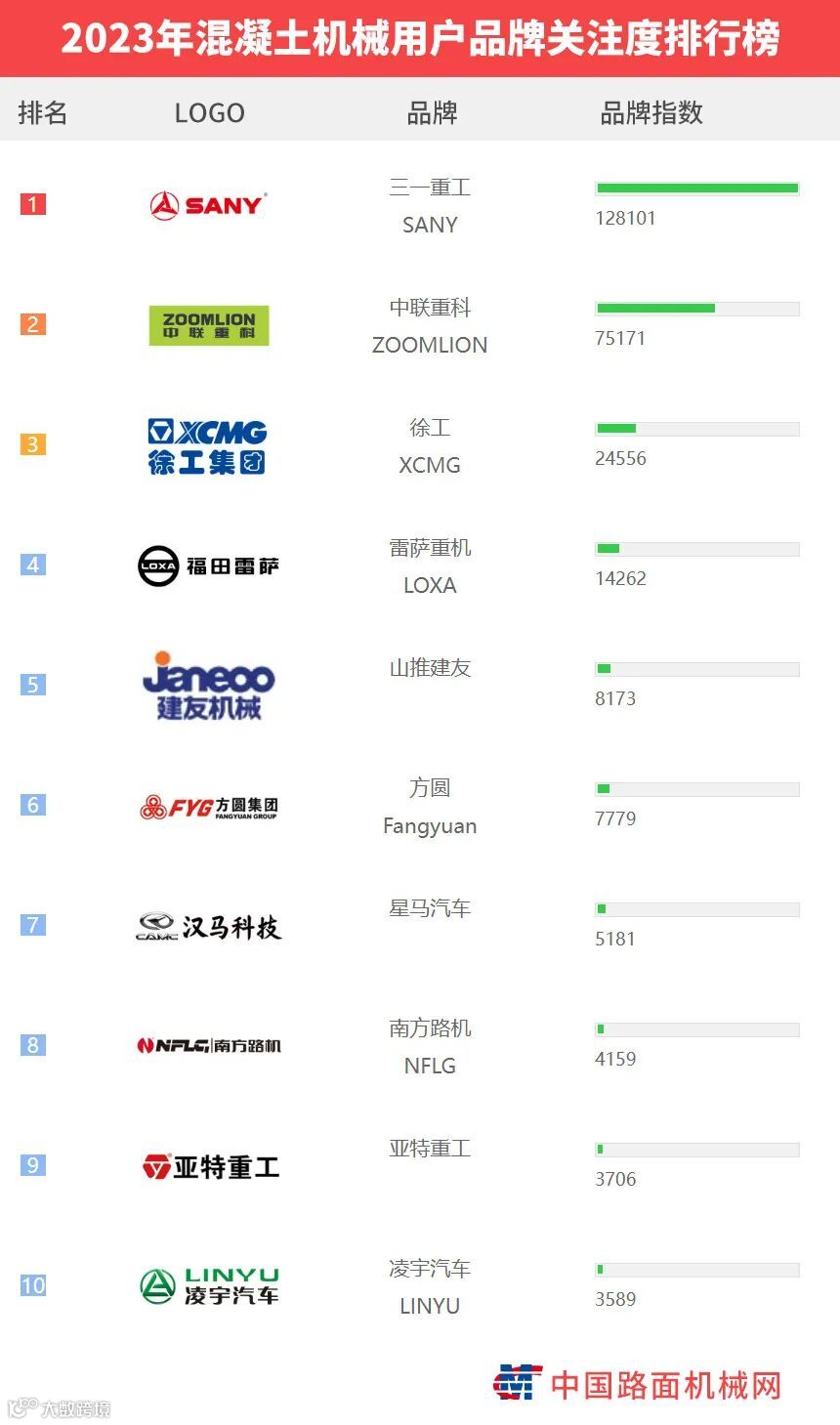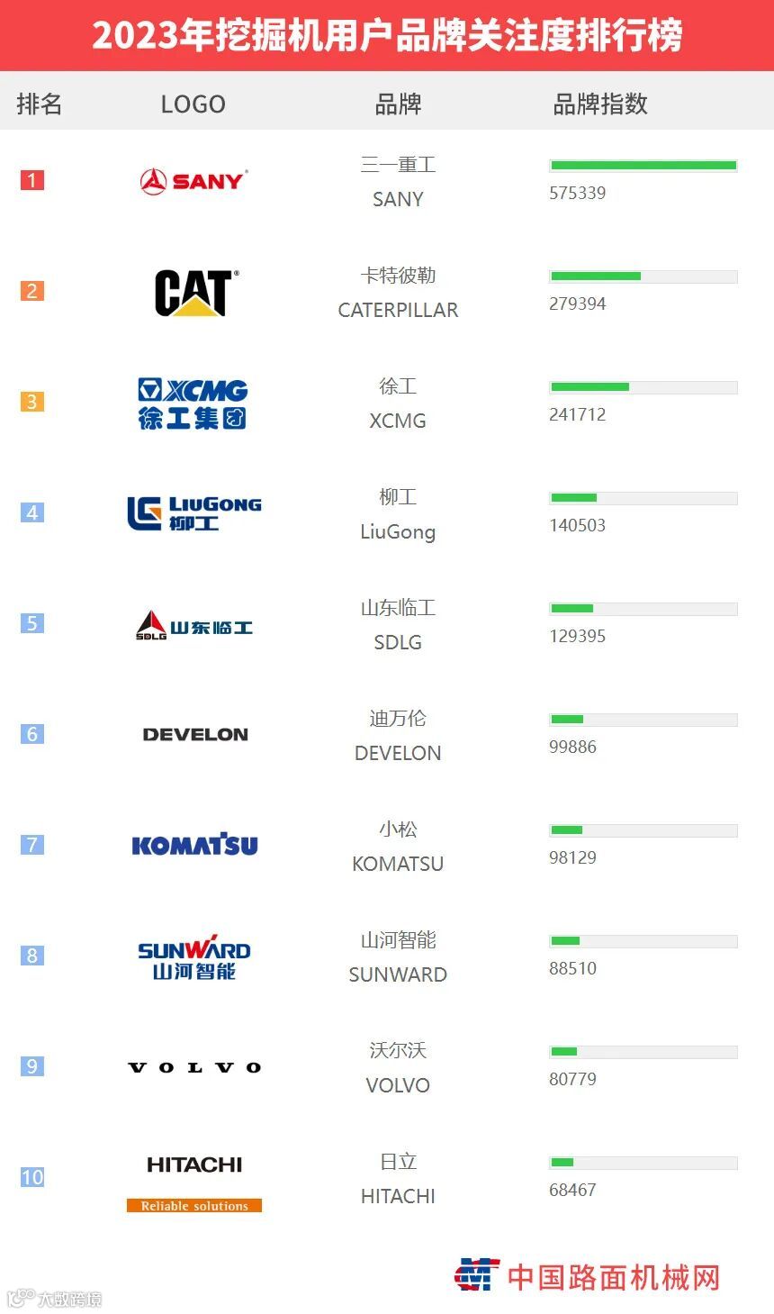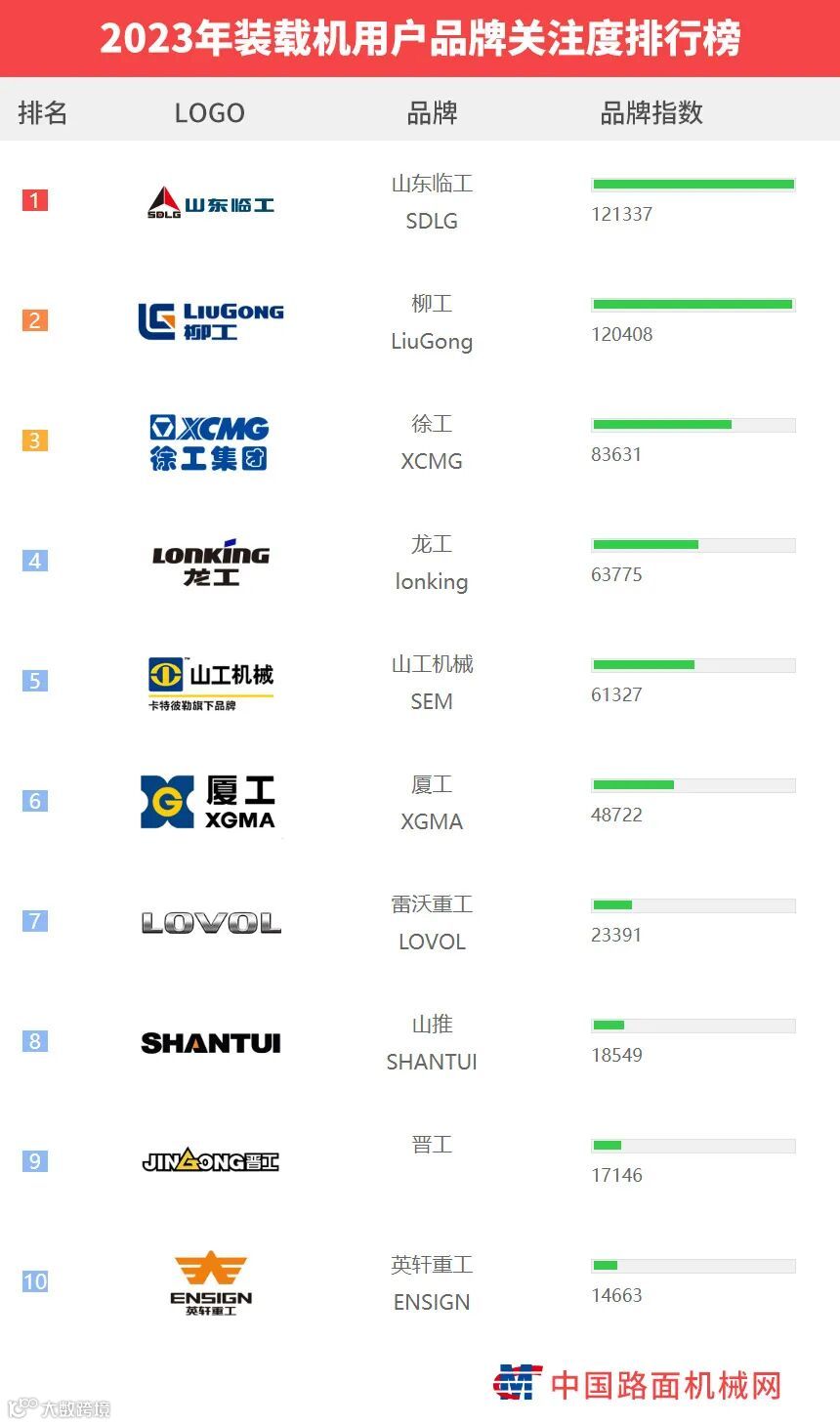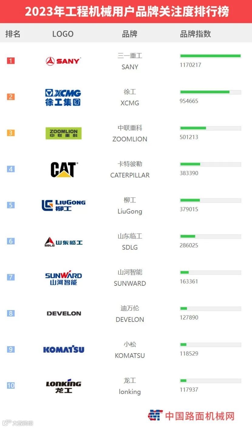 “工程机械用户品牌关注度排行榜”是基于中国路面机械网海量用户在2023年内对所有品牌、产品的浏览及在线询价次数而生成的品牌关注度指数。