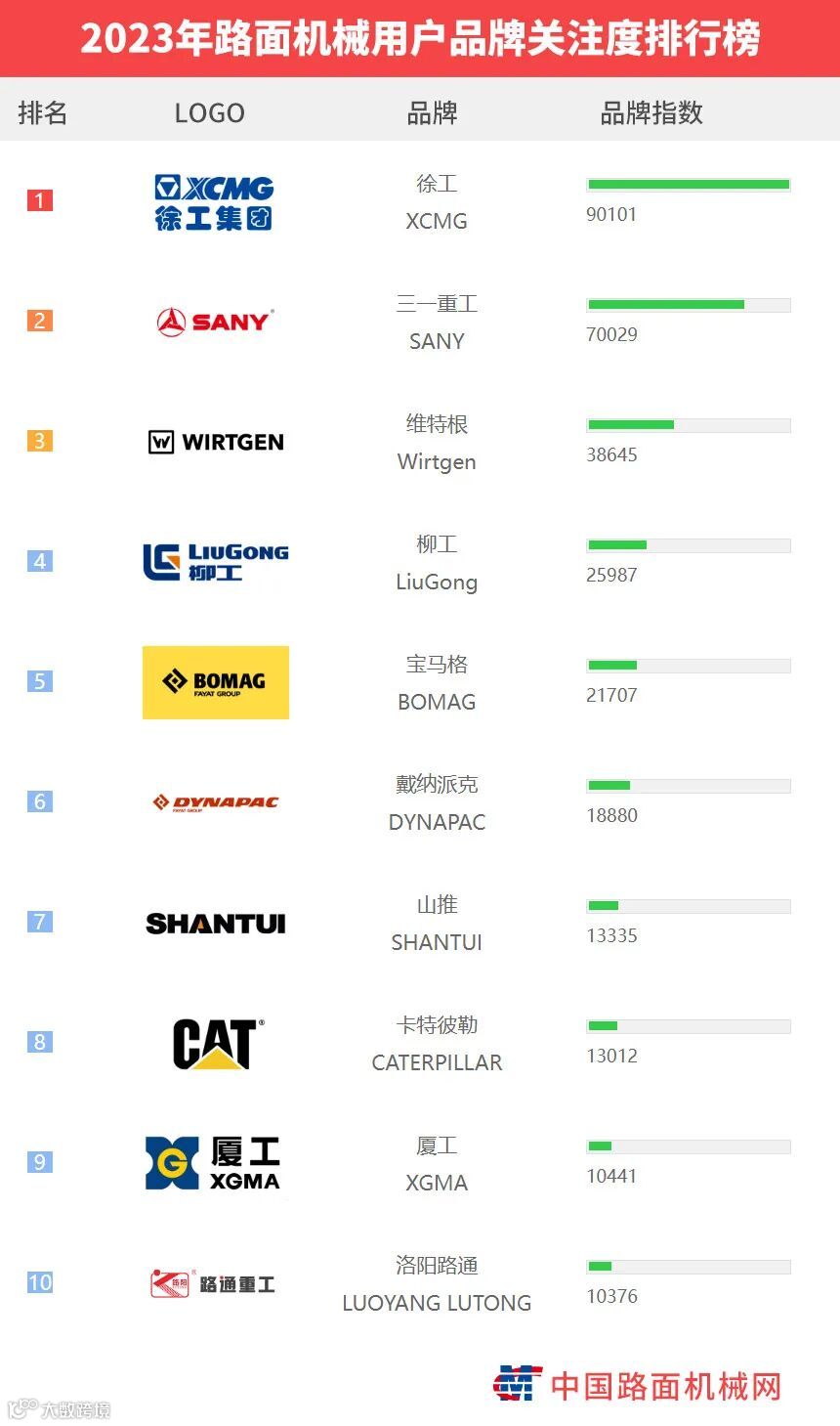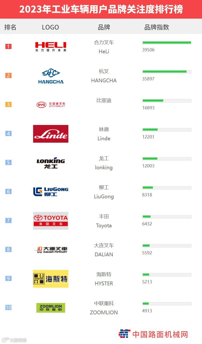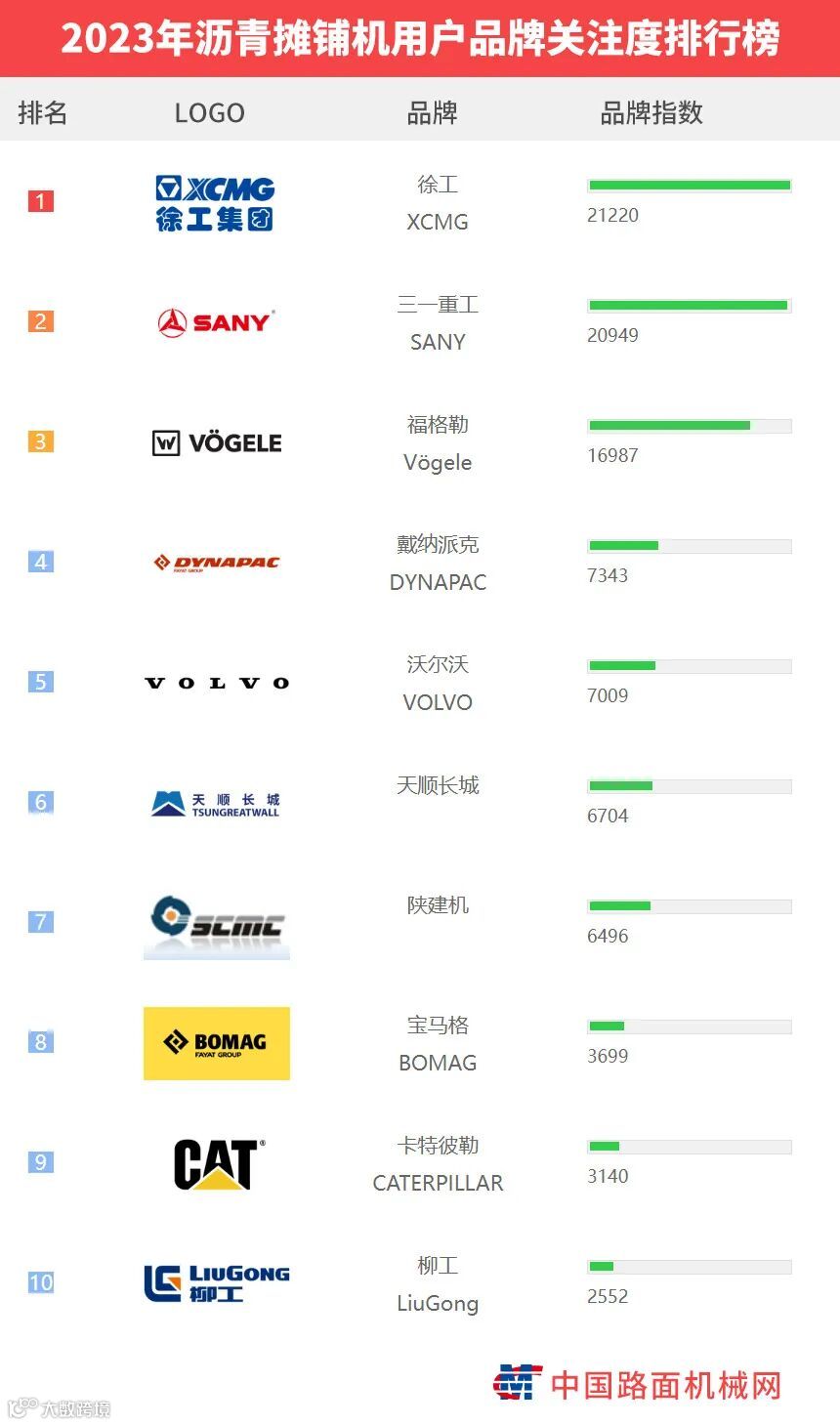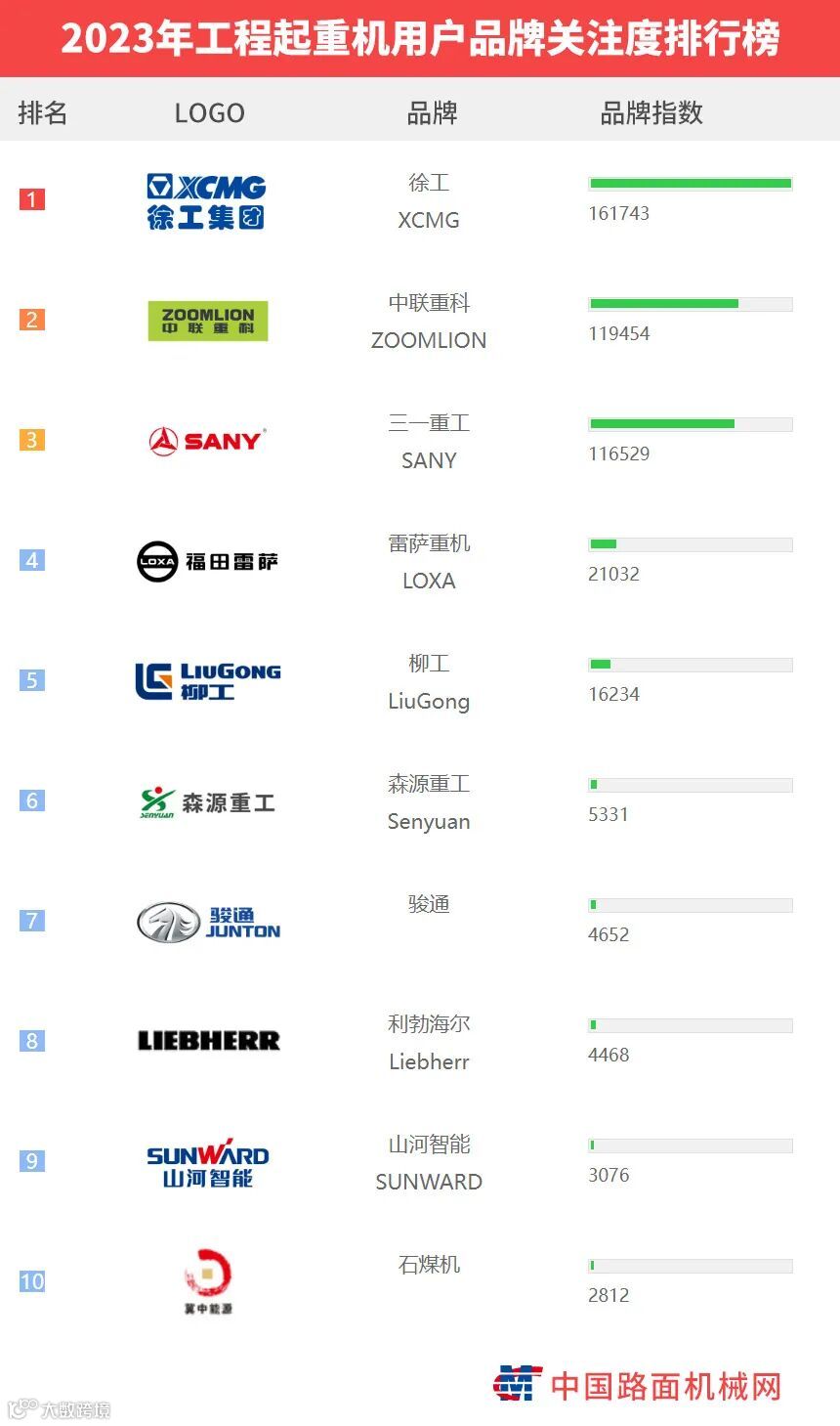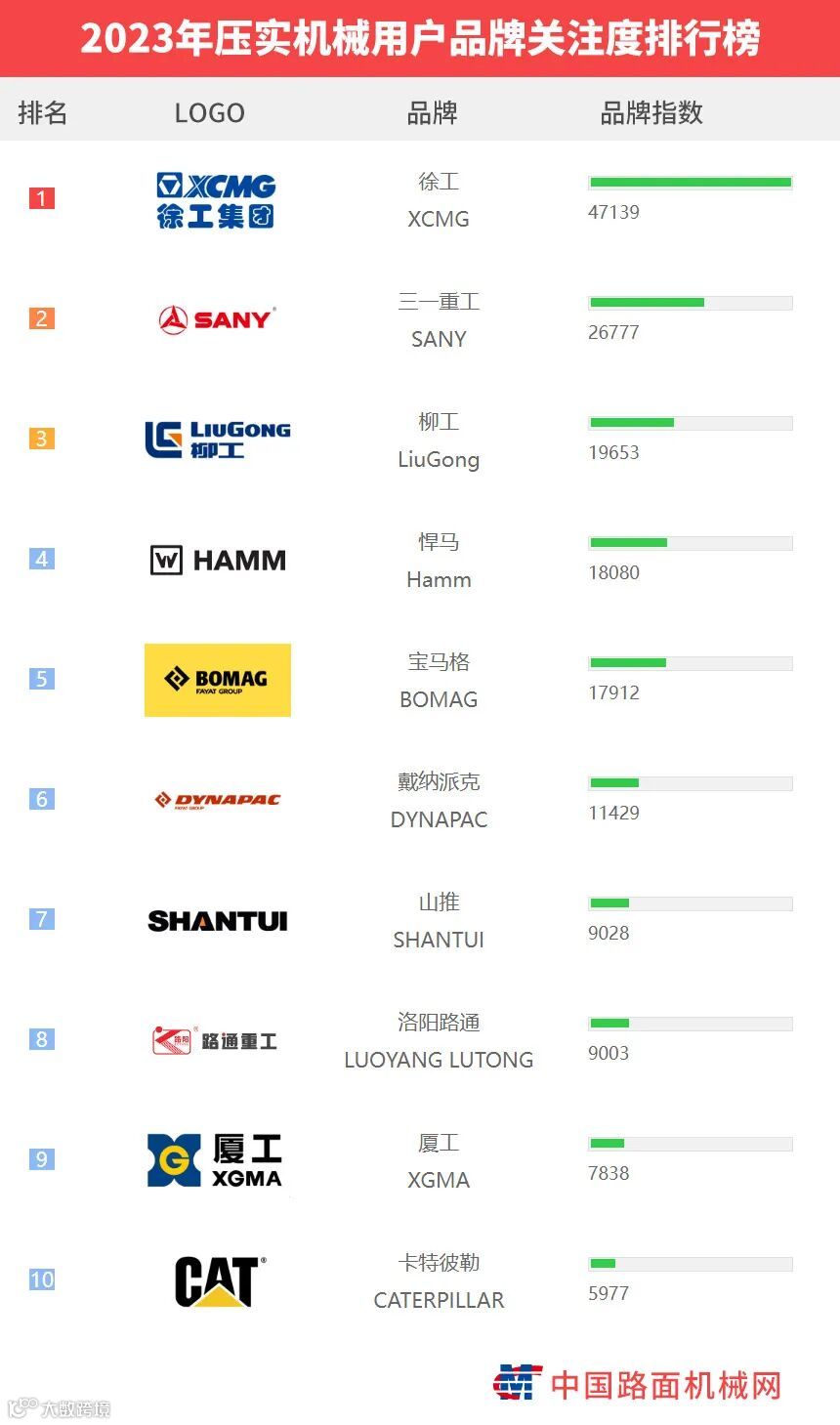 “工程机械用户品牌关注度排行榜”是基于中国路面机械网海量用户在2023年内对所有品牌、产品的浏览及在线询价次数而生成的品牌关注度指数。