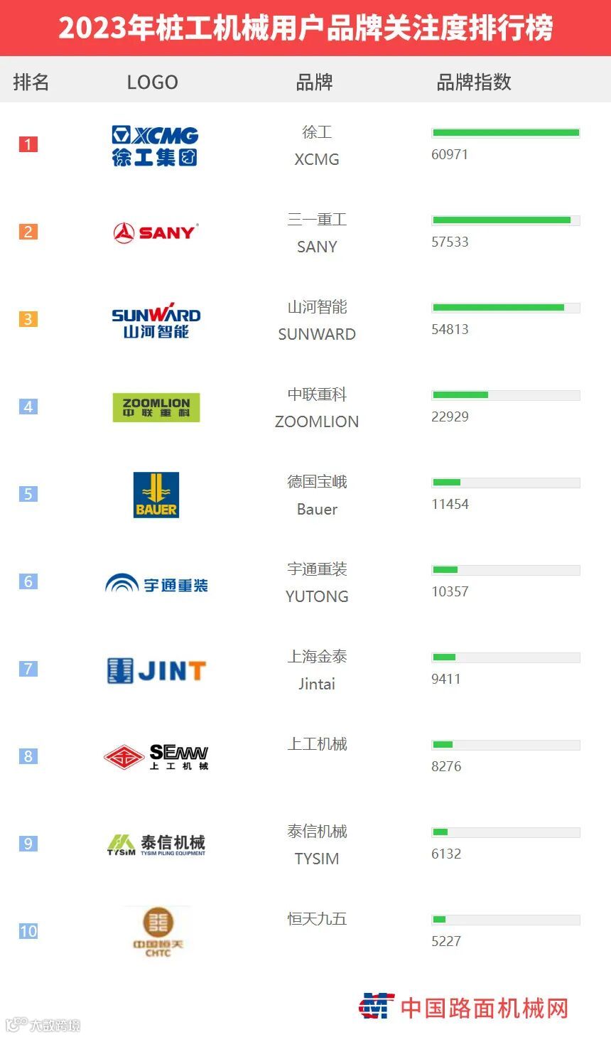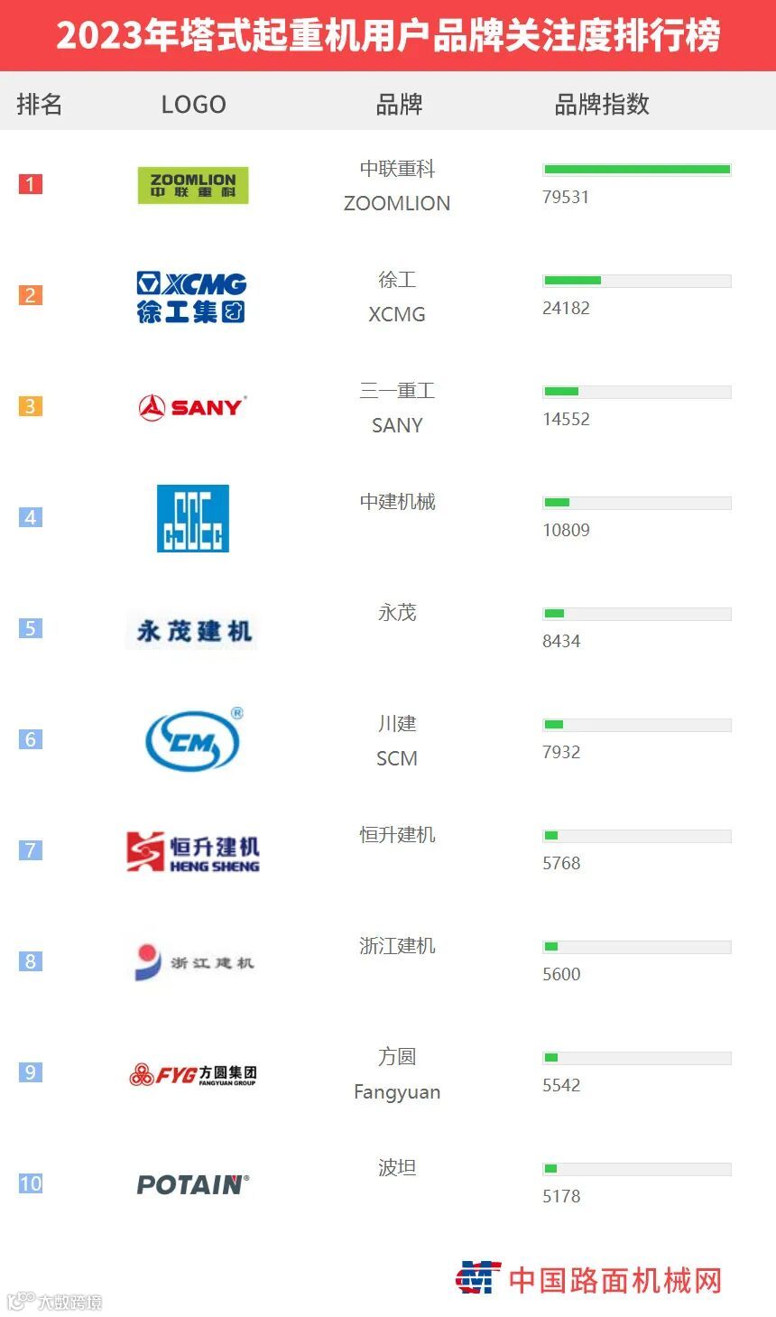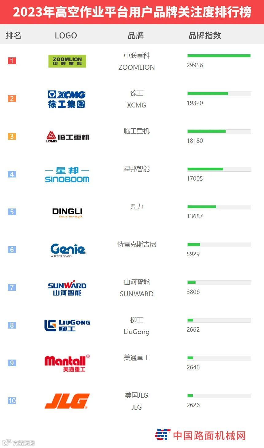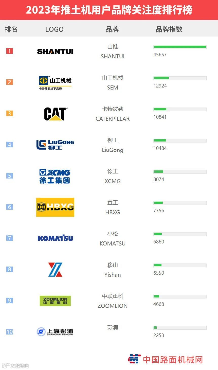 “工程机械用户品牌关注度排行榜”是基于中国路面机械网海量用户在2023年内对所有品牌、产品的浏览及在线询价次数而生成的品牌关注度指数。