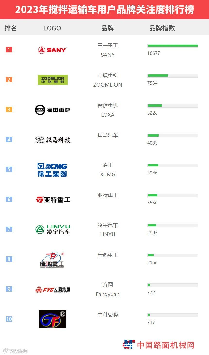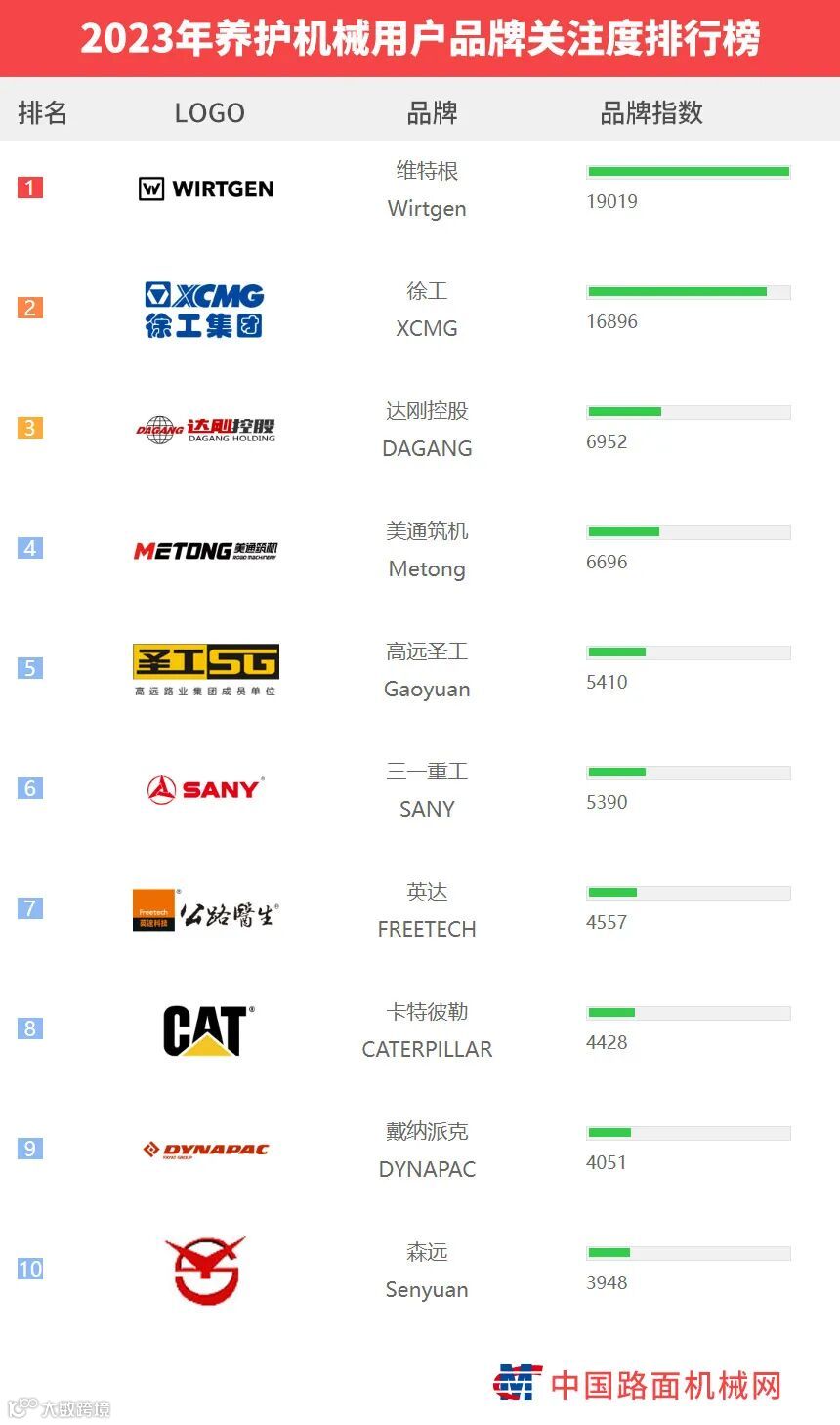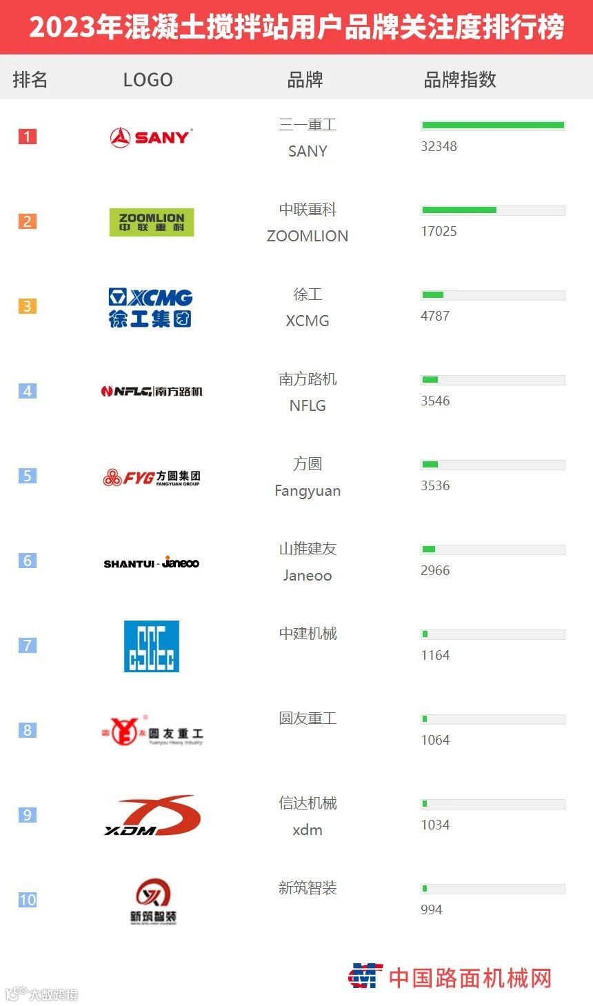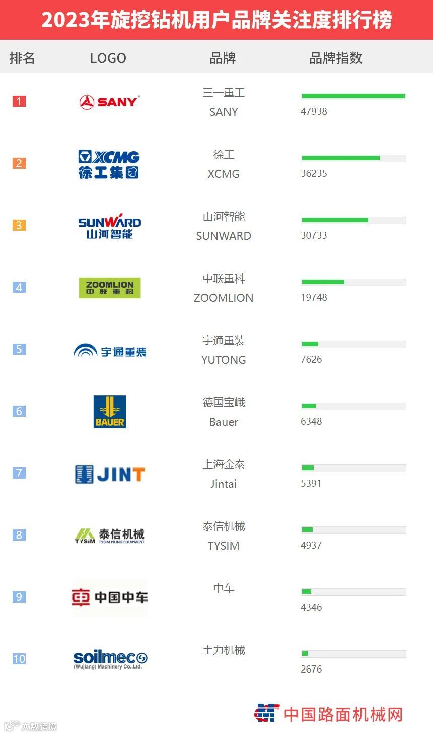 “工程机械用户品牌关注度排行榜”是基于中国路面机械网海量用户在2023年内对所有品牌、产品的浏览及在线询价次数而生成的品牌关注度指数。