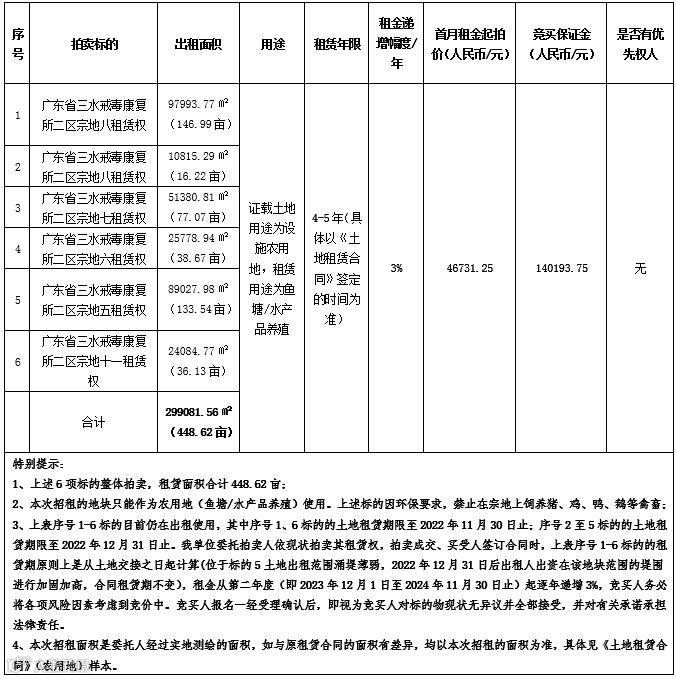 4、该标的情况及特别说明请登录交易平台详细查看本公告附件内容:《标的情况及特别说明》、《土地租赁合同(农用地)》样本及《拍卖规则和注意事项》。