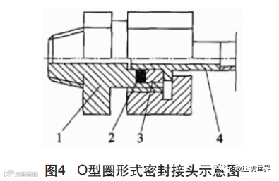 在采用O型圈进行密封时,必须要和挡圈共同使用才能起到密封的效果,如图4所示为O型圈形式密封接头示意图,其中件1为接头部件,件2为O型圈,件3为挡圈,件4为钢管,在接头部件上加工密封件安装沟槽,钢管的端部要和接头部件保持较好的垂直度,且与O型圈接触部分达到较好的粗糙度。这种密封方式最高可以达到100 MPa的超高压密封,少数可以实现100 MPa以上的密封。