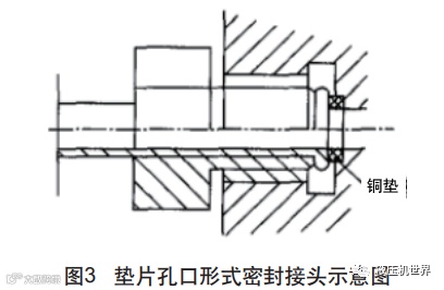 该种密封方式的钢管通常选择材质为15#的优质碳素结构钢,壁厚根据压力的增加而提升.管子端面通过专用的机械设备经加热处理后打磨平整,当平整度仍然达不到设计要求时,需要采用数控车床进行精加工,加工完成后在钢管端面与接头孔之间添加铜垫圈,并用螺母并紧,这种密封方式可以承受100 MPa以下的工作压力,如图3所示为垫片孔口形式密封接头示意图。