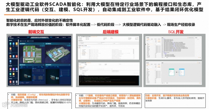 在SCADA场景下,典型做法是利用大模型在特定行业场景下的编程接口和生态库,产生工业逻辑代码(交互、建模、SQL开发),自动集成到工业软件中,基于结果闭环优化模型。