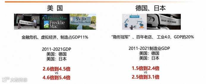 无论是制造业的规模、增速还是竞争力,美国均持续领先德国和日本,并且差距不断拉大:2011到2021年,美国制造业规模相当于德国的1.5倍扩大到2.4倍,相当于日本的2.5倍扩大到3.1倍。美国制造业仍然以比日本和德国更快的速度发展。
