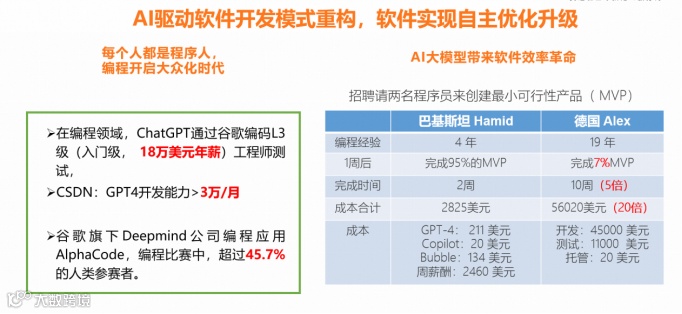 根据CSDN在2023年初的评估,GPT4的软件编程能力相当于国内月薪3万元的软件工程师能力,相当于谷歌年薪18万美元L3级工程师。美国一个软件岗位招聘做了一个测试:一个只有4年编程经验的工程师借助AI工具,其软件开发效率相当于19年编程经验的5倍。