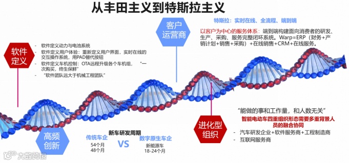 特斯特引领全球汽车工业电动化、智能化,正如瓦伦丁在《从丰田主义到特斯拉主义》所描述的,电动车领域的数字原生企业正在重新定义汽车,在个性化、以用户为中心的万物互联、万物智能时代,新物种为应对不确定性而生,以高频创新为驱动,基于进化组织的迭代思维,从MVP小步快跑加速商业化。