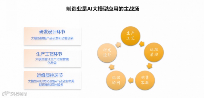 AI大模型的通用性、泛化性,以及基于“预训练+精调”的新开发范式,将从研发设计、生产工艺、运维质控、销售客服、组织协同等各个环节赋能制造业。
