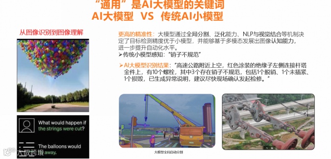 在设备运维环节,AI大模型大幅增强了传统垂直模型的能力。AI大模型具备了理解能力,电力行业无人机在山区电力设备上采集信息后,传统垂直小模型给出的判断:“销子不规范”,而大模型能够基于多模态发展出图像认知能力,给出的结论是:“高速公路附近上空,红色涂装的绝缘子左侧连接杆塔金件上,有10个螺栓,其中3个存在销子不规范,包括1个脱销、1个未插紧、1个损毁,已生成异常说明,建议尽快现场确认发起检修。”