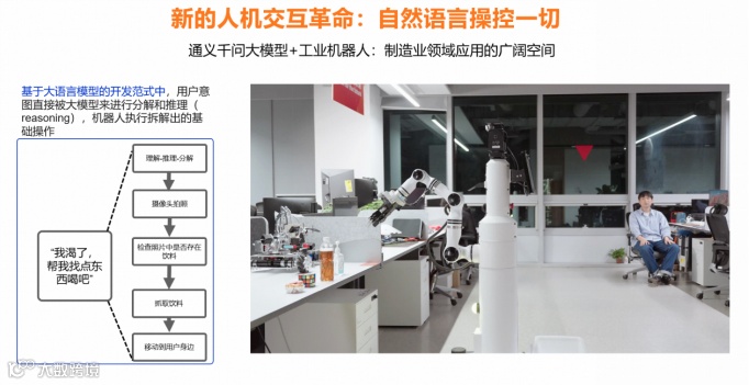 例如国内机器人公司,借助通义大模型开发机器人行业模型,基于自然语言,可以实现人和机器的互动。如机器人收到了人的指令后,可以进行理解、推理和分析,并自动生成软件代码,组织协调不同智能体完成不同场景下的任务。