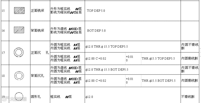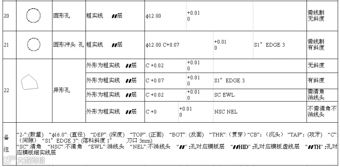 6. 英文注解“UNLESS OTHERWISE SPECIFIED OTHER HOLES MUST BE MADE SHARP CORNER AND HAVE THE ESCAPED LINE WIRELINE”的意思是:除特殊标注外,其它孔全部清角消线头. 对作了以上标注的模板中不清角及不消线头的孔,在注解中需要单独注明.