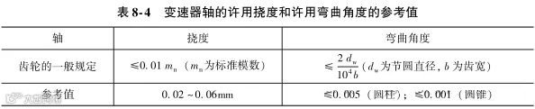 2)将受力大的齿轮布置在靠近轴承的位置, 以减小轴的挠度和弯矩, 提高临界转速。变速器轴的变形将导致齿轮倾斜、 轴承受力不均, 表 8-4 所列为变速器轴的许用挠度和许用弯曲角度的参考值。