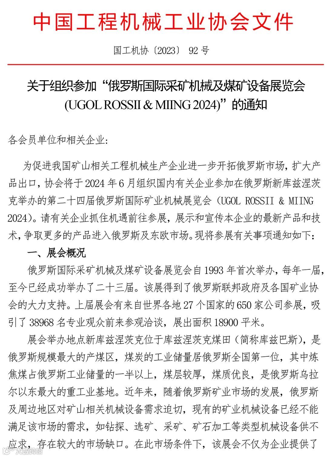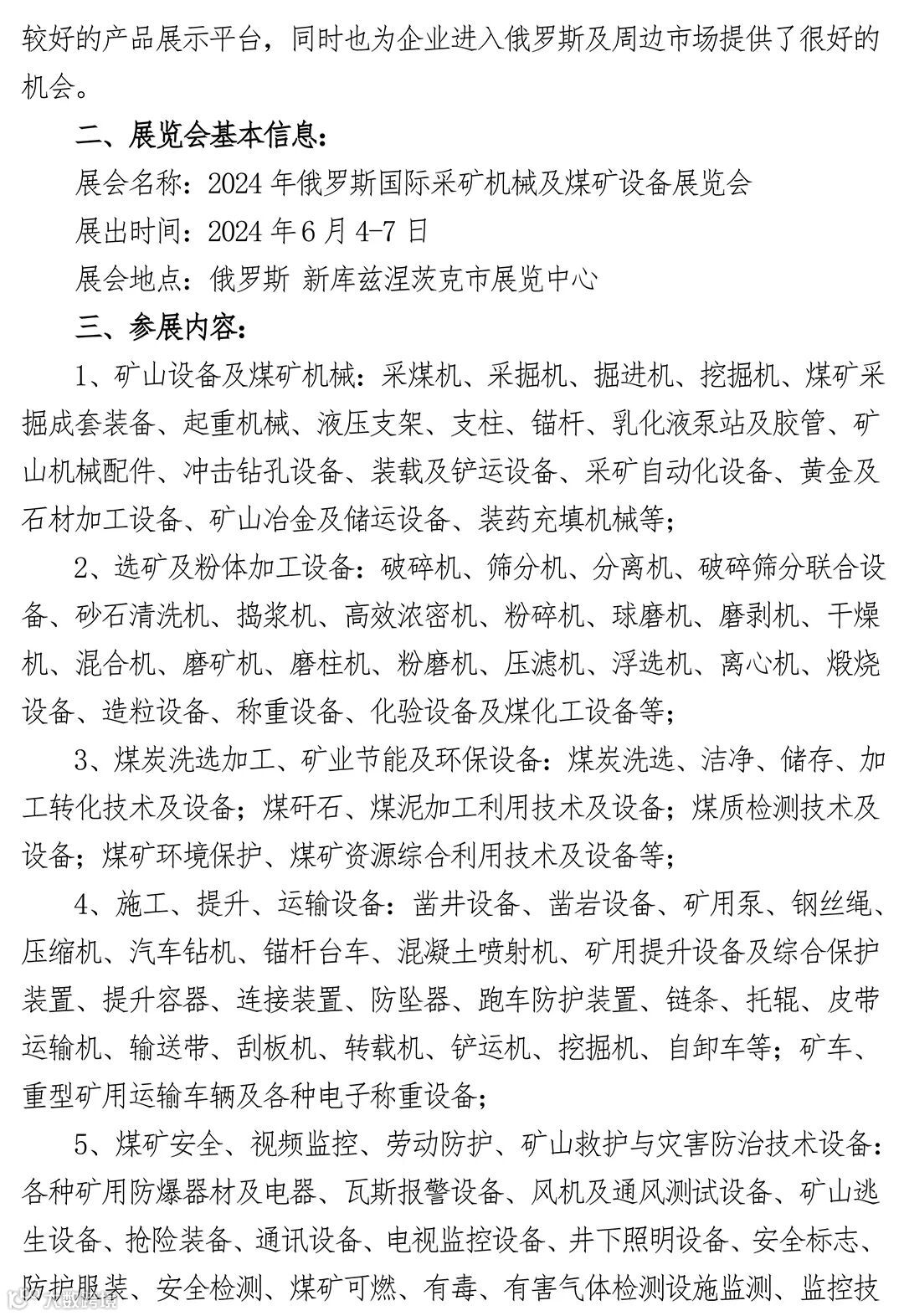 为促进我国矿山相关工程机械生产企业进一步开拓俄罗斯市场,扩大产品出口,协会将于2024年6月组织国内有关企业参加在俄罗斯新库兹涅茨克举办的第二十四届俄罗斯国际矿业机械展览会(UGOL ROSSII & MIING 2024)。请有关企业抓住机遇前往参展,展示和宣传本企业的最新产品和技术,争取更多的产品进入俄罗斯及东欧市场。现将参展有关事项通知如下: