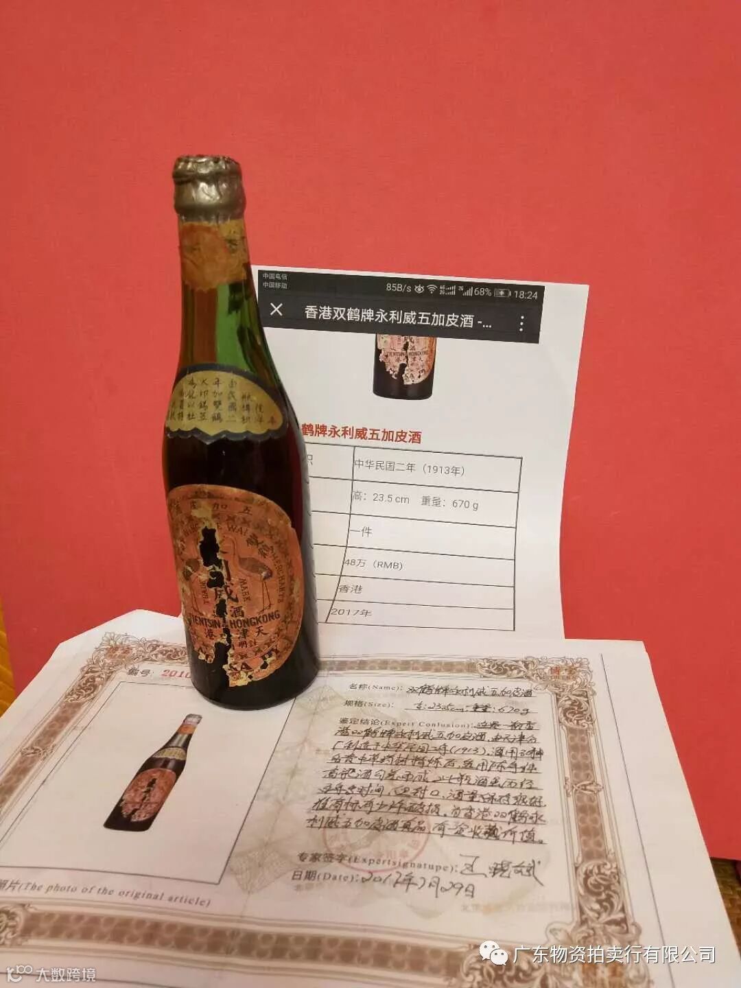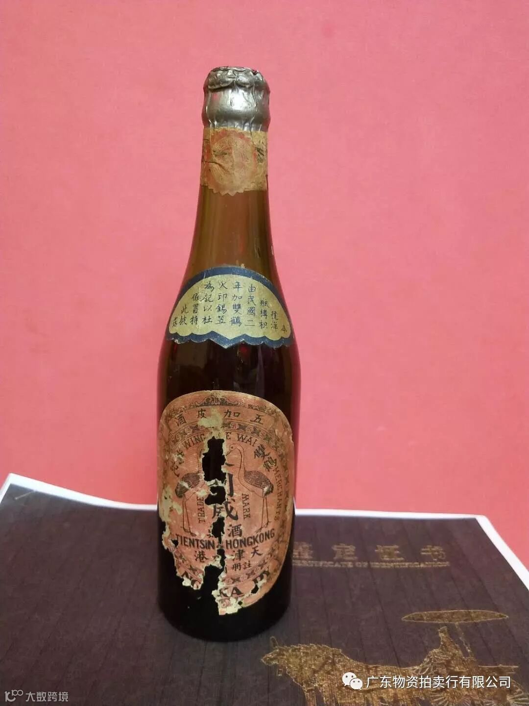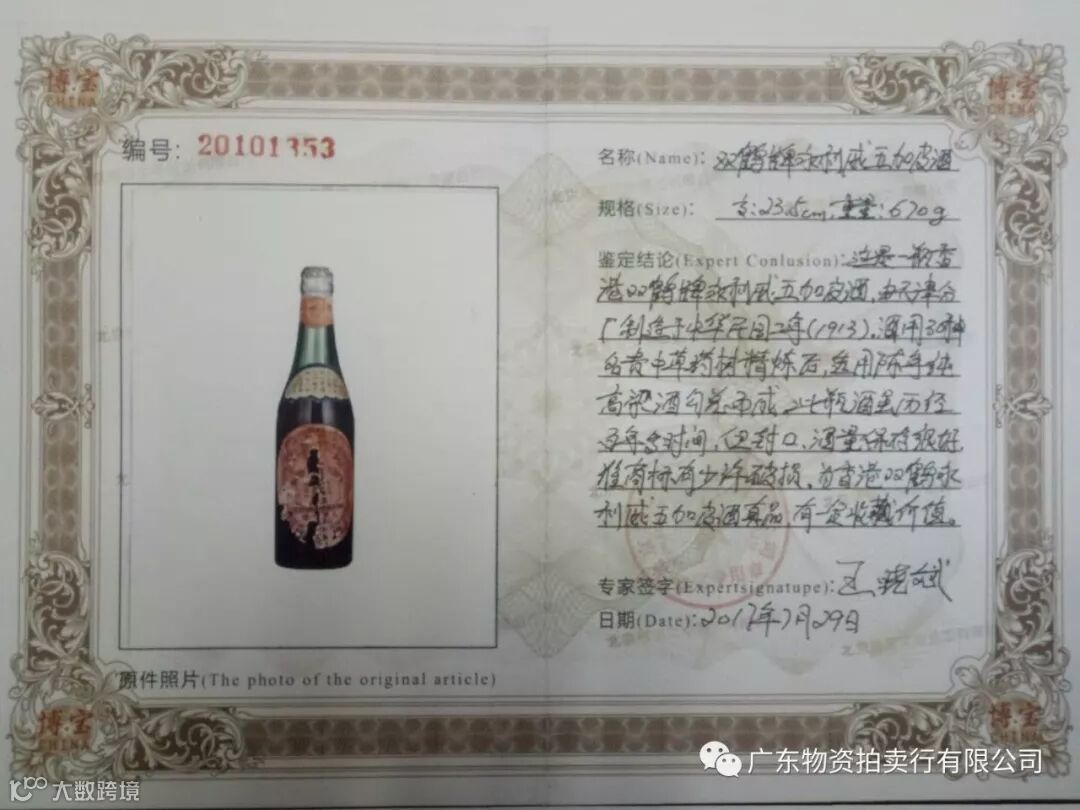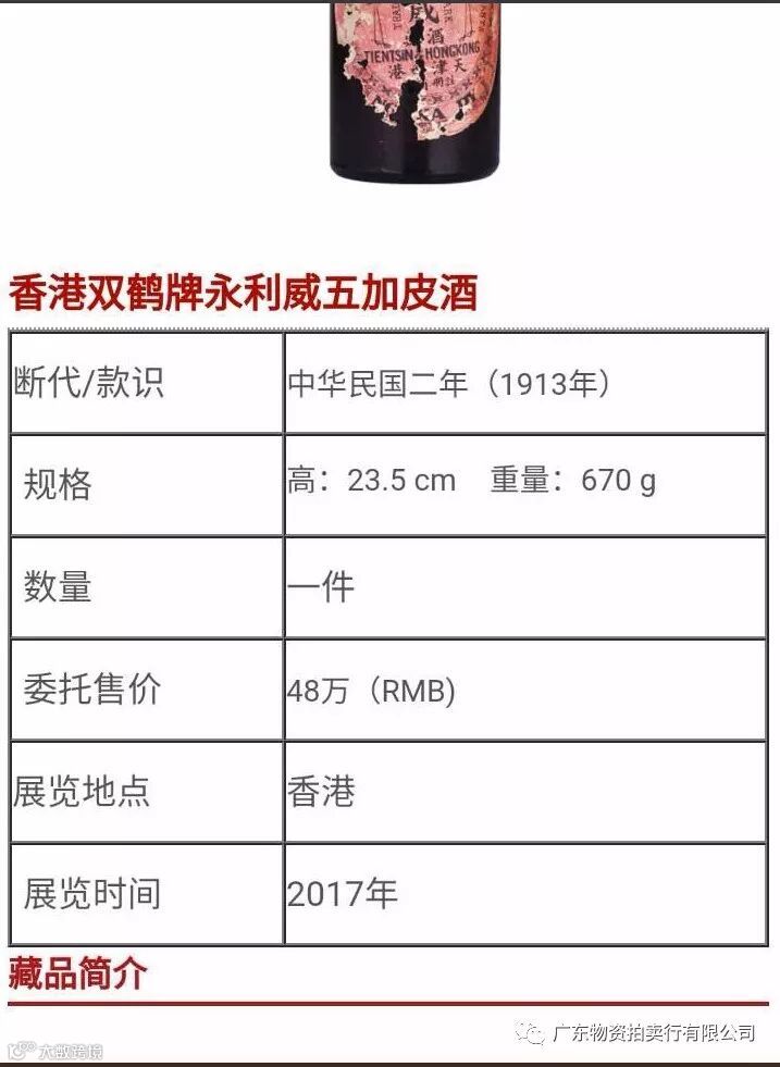 香港双鹤牌永利威五加皮酒一支(民国二年出品),参考价¥48万元,竞买保证金¥5万元。