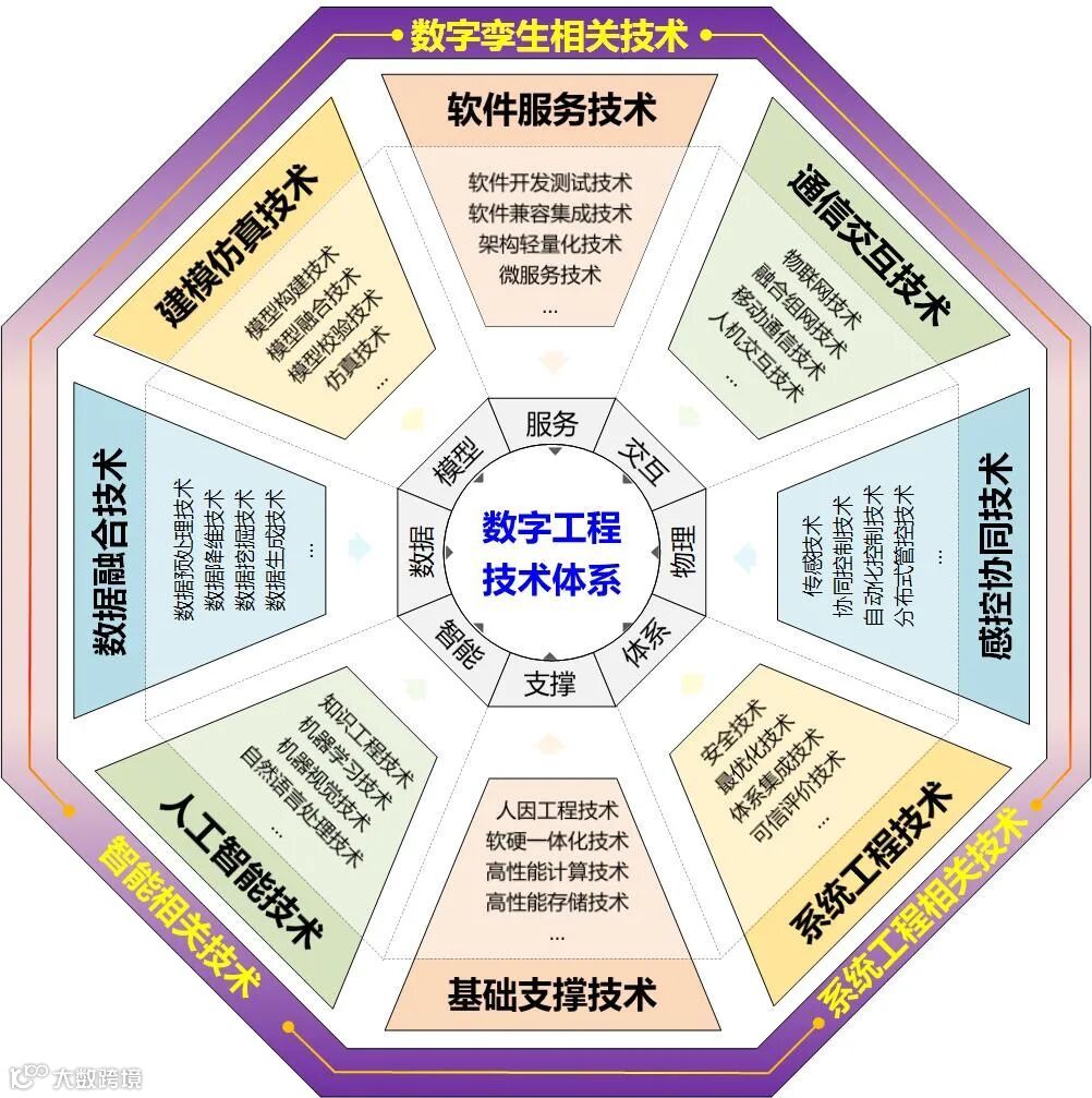 (7)单一技术无法实现数字工程,需综合运用多种技术 。数字工程由物理对象、模型、数据、服务、网络、算力、算法、安全等多种要素协同实现,涉及需求分析、环境感知、状态认知、结果预知、决策优化、智能运维、精准管控等多方面能力,每种能力都需要相应的理论方法、技术手段和软件工具支持 。