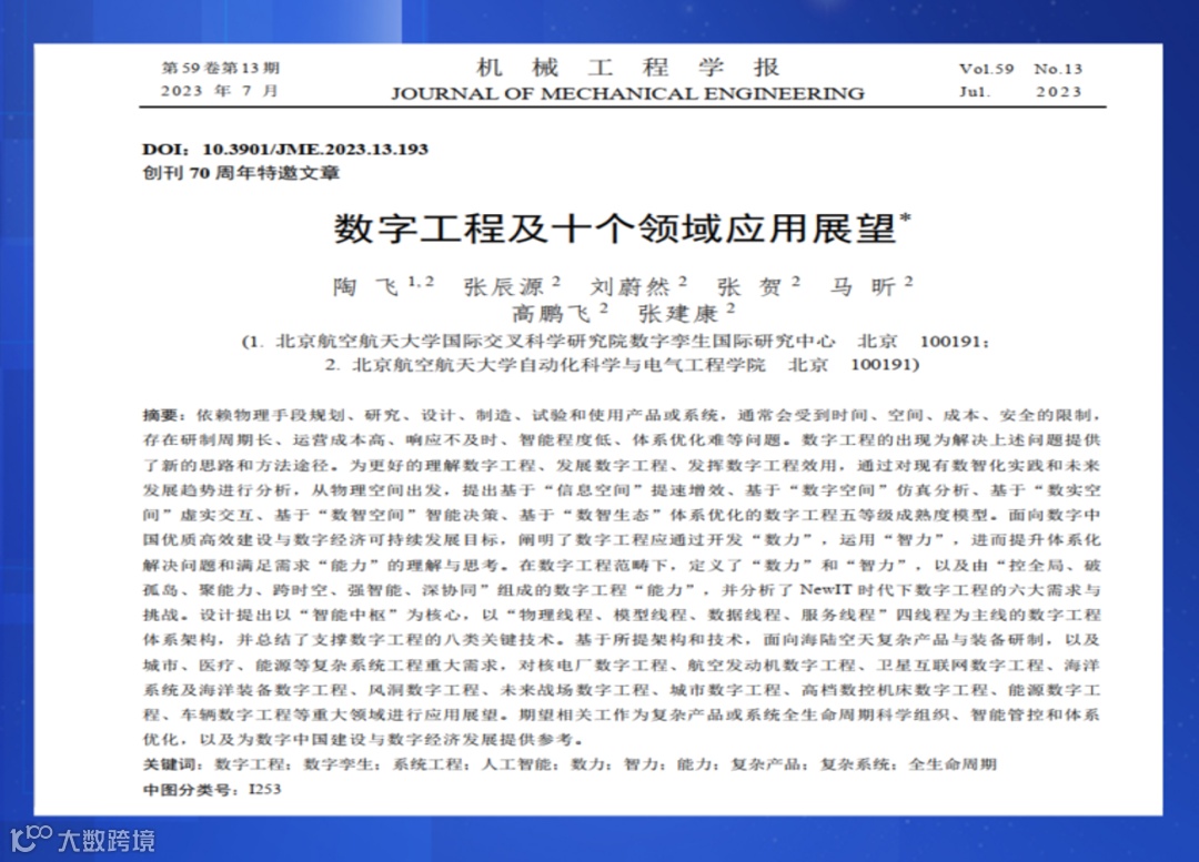 本文作为 《机械工程学报》创刊70周年特邀文章 (2023年第13期的封面文章)发表,期望相关工作为复杂产品或系统全生命周期科学组织、智能管控和体系优化,以及为数字中国建设与数字经济发展提供参考 。
