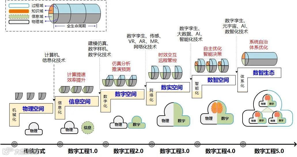 (5)数字工程不是聚焦局部的单元工程,而是放眼全局的系统工程 。尽管数字工程能够用于解决特定单一问题和满足个性化需求,但数字工程更强调利用物理域、信息域、过程域、知识域四域融合,从更高的层次、更全的角度面向需求和问题综合考虑全要素和全信息,力求通过产品或系统全过程、全生命周期的系统性组织与统筹规划,实现产品或系统全功能的全局最优化,进而满足全业务需求 。