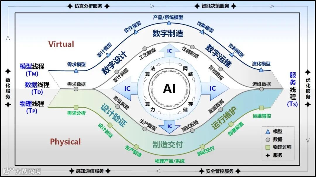 (4)服务线程 (Service thread, TS )指物理产品或系统全生命周期中依托各类软件和程序代码、插件等实现的各种功能和服务,包括感知通信服务、数化服务、仿真分析服务、智能决策服务、优化服务、安全管控服务等。服务的形式包括但不限于平台、软件、API、工具包、插件、功能块、功能函数和具有一定服务能力的物理与虚拟对象。感知通信服务指基于各种硬件资源实现的状态感知、信息获取、数据录入、数据传输等功能服务,用于支持物理产品或系统与环境、人、模型等之间的数据交互过程;数化服务指基于物理世界构建数字世界的相关服务,包括产品、系统、过程、业务、功能、环境等全要素模型的构建与校验;仿真分析服务包括回溯分析、预测分析、多场耦合分析等服务,基于数模联动,在数字世界中实现对物理产品或系统的结构、功能、运行过程以及相关现象和问题的深入分析;智能决策与优化服务包括知识挖掘、自主学习、实时决策、自适应、自优化等服务,为产品或系统的智能自治和持续优化进化提供基础;安全管控服务包括物理产品或系统的安全生产、安全部署、安全使用和安全控制等服务,用于实现产品或系统研制、交付、部署、使用和维护等物理过程,使产品或系统的能力和价值得到充分发挥和利用。