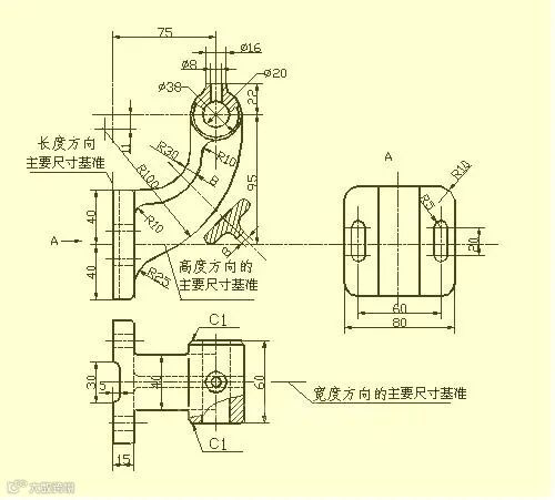 在标注叉架类零件的尺寸时,通常选用安装基面或零件的对称面作为尺寸基准。尺寸标注方法参见图。