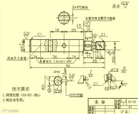 在标注轴套类零件的尺寸时,常以它的轴线作为径向尺寸基准。由此注出图中所示的Ф14 、Ф11(见A-A断面)等。这样就把设计上的要求和加工时的工艺基准(轴类零件在车床上加工时,两端用顶针顶住轴的中心孔)统一起来了。而长度方向的基准常选用重要的端面、接触面(轴肩)或加工面等。