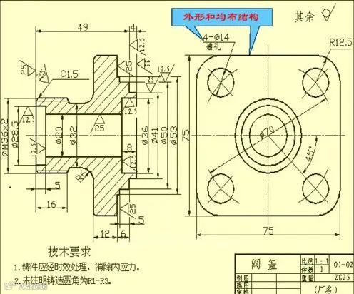 这类零件的基本形状是扁平的盘状,一般有端盖、阀盖、齿轮等零件,它们的主要结构大体上有回转体,通常还带有各种形状的凸缘、均布的圆孔和肋等局部结构。在视图选择时,一般选择过对称面或回转轴线的剖视图作主视图,同时还需增加适当的其它视图(如左视图、右视图或俯视图)把零件的外形和均布结构表达出来。如图中所示就增加了一个左视图,以表达带圆角的方形凸缘和四个均布的通孔。