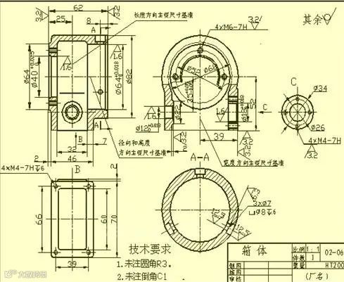 在标注尺寸方面,通常选用设计上要求的轴线、重要的安装面、接触面(或加工面)、箱体某些主要结构的对称面(宽度、长度)等作为尺寸基准。对于箱体上需要切削加工的部分,应尽可能按便于加工和检验的要求来标注尺寸。