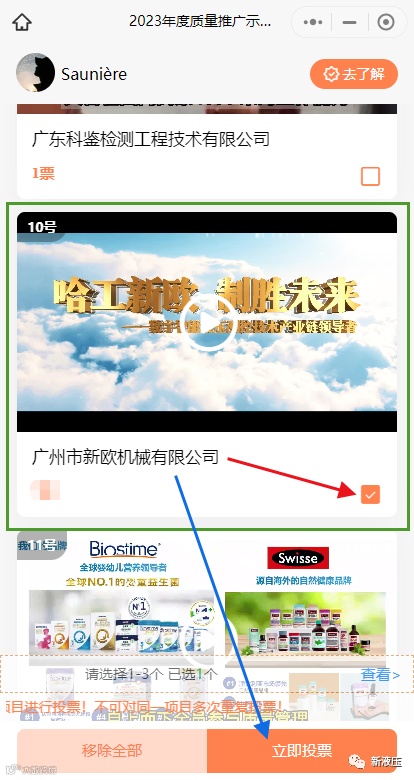 导读:请投票10号,【广州市新欧机械有限公司】点击打开小程序-手指向上滑动屏幕选择【10号】-(广州市新欧机械有限公司)拉到下面选择【10号】