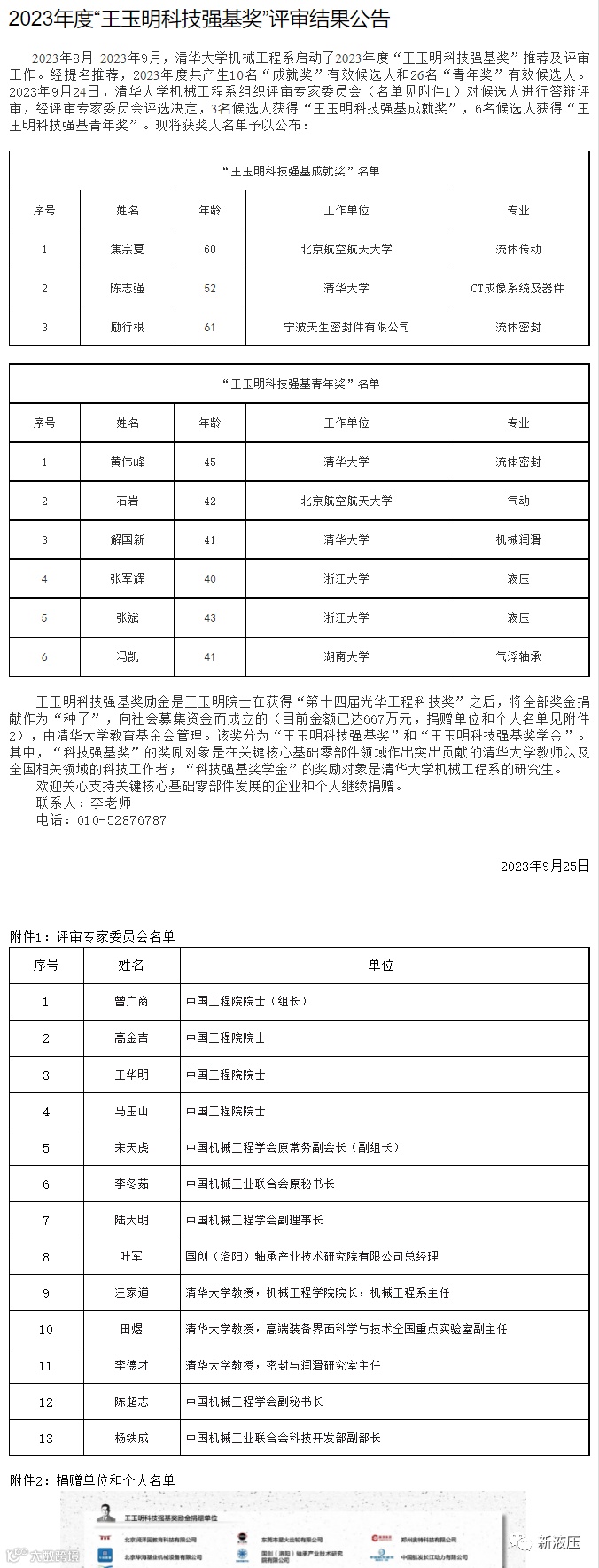 2023年8月-2023年9月,清华大学机械工程系启动了2023年度“王玉明科技强基奖”推荐及评审工作。经提名推荐,2023年度共产生10名“成就奖”有效候选人和26名“青年奖”有效候选人。2023年9月24日,清华大学机械工程系组织评审专家委员会(名单见附件1)对候选人进行答辩评审,经评审专家委员会评选决定,3名候选人获得“王玉明科技强基成就奖”,6名候选人获得“王玉明科技强基青年奖”。现将获奖人名单予以公布: